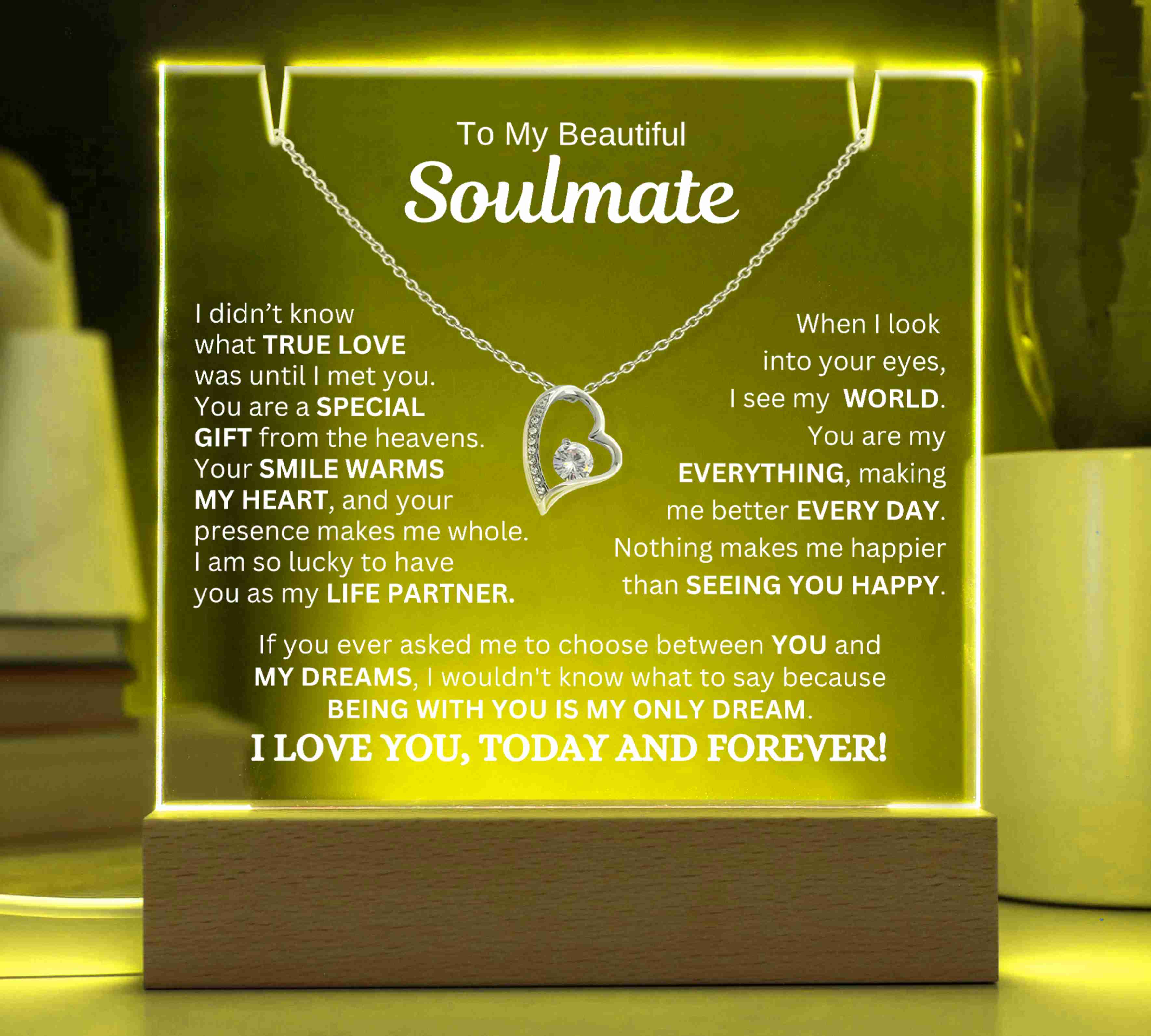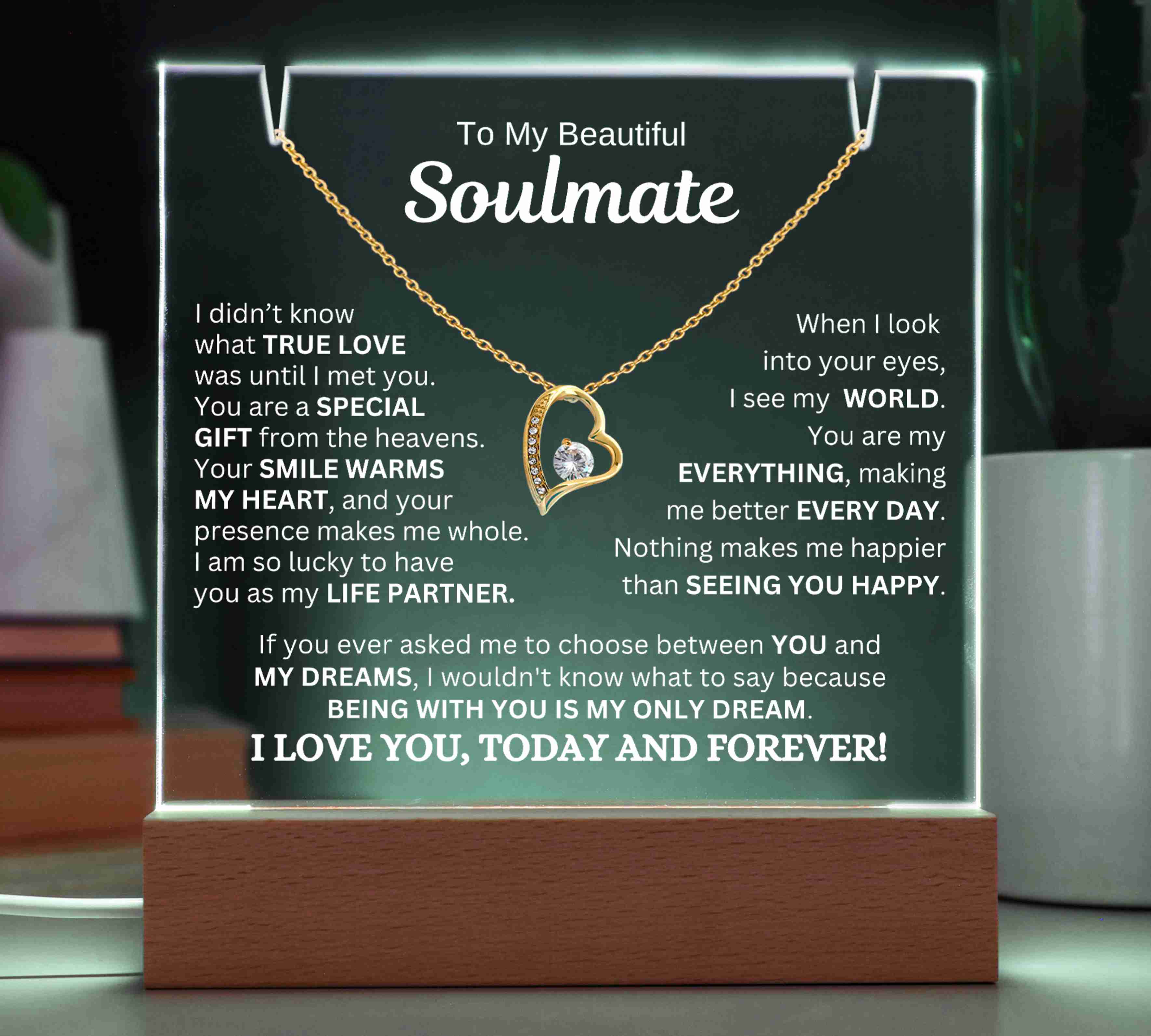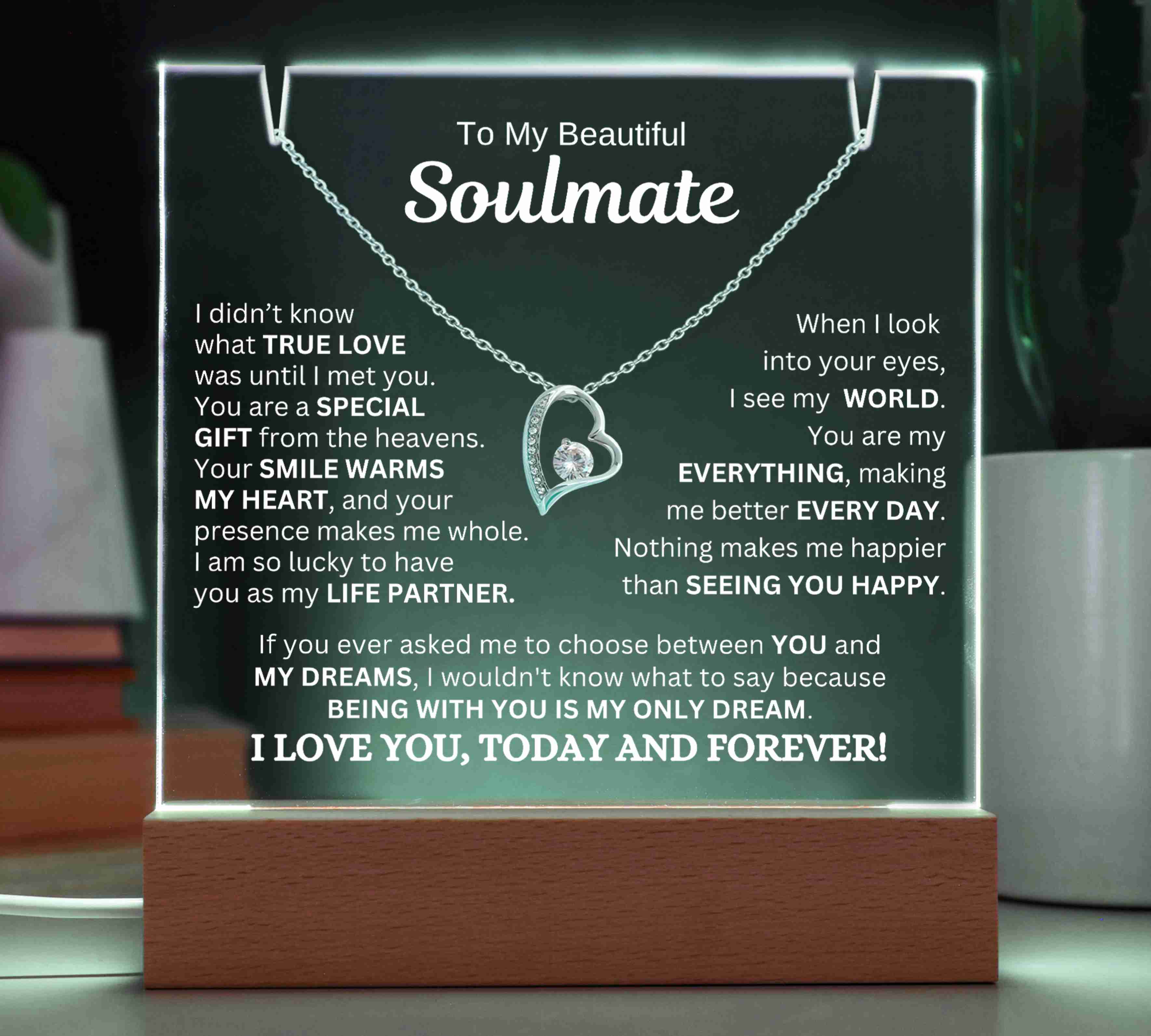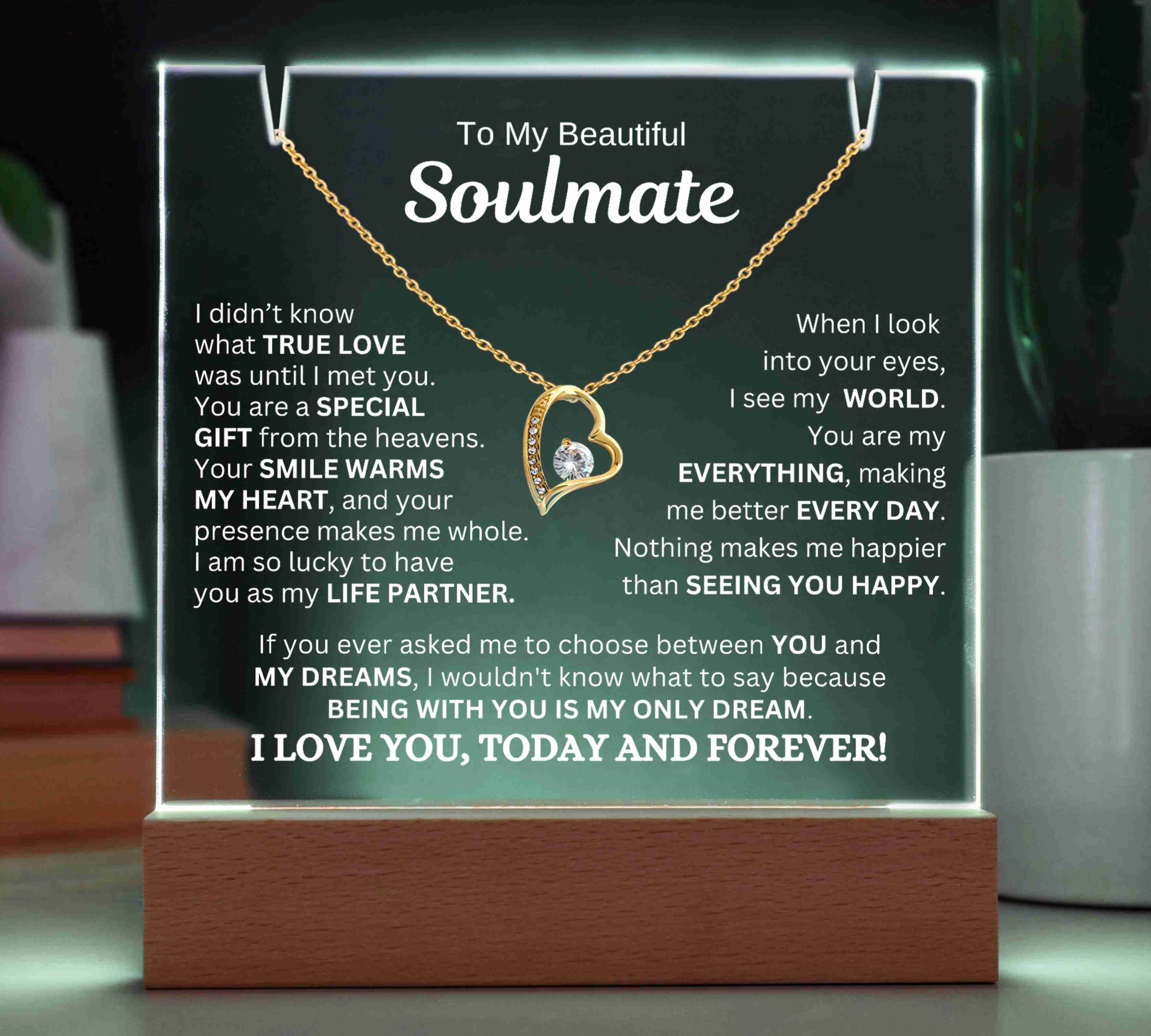 "TO MY SOULMATE, I DIDN’T KNOW WHAT TRUE LOVE WAS UNTIL I MET YOU. YOU ARE A SPECIAL GIFT FROM THE HEAVENS. YOUR SMILE WARMS MY HEART, AND YOUR PRESENCE MAKES ME WHOLE. I AM SO LUCKY TO HAVE YOU AS MY LIFE PARTNER. WHEN I LOOK INTO YOUR EYES, I SEE MY WORLD. YOU ARE MY EVERYTHING, AND YOU MAKE ME BETTER EVERY DAY. NOTHING MAKES ME HAPPIER THAN SEEING YOU SMILE. IF YOU EVER ASKED ME TO CHOOSE BETWEEN YOU AND MY DREAMS, I WOULDN'T KNOW WHAT TO SAY BECAUSE BEING WITH YOU IS MY ONLY DREAM. I LOVE YOU, TODAY AND FOREVER!"