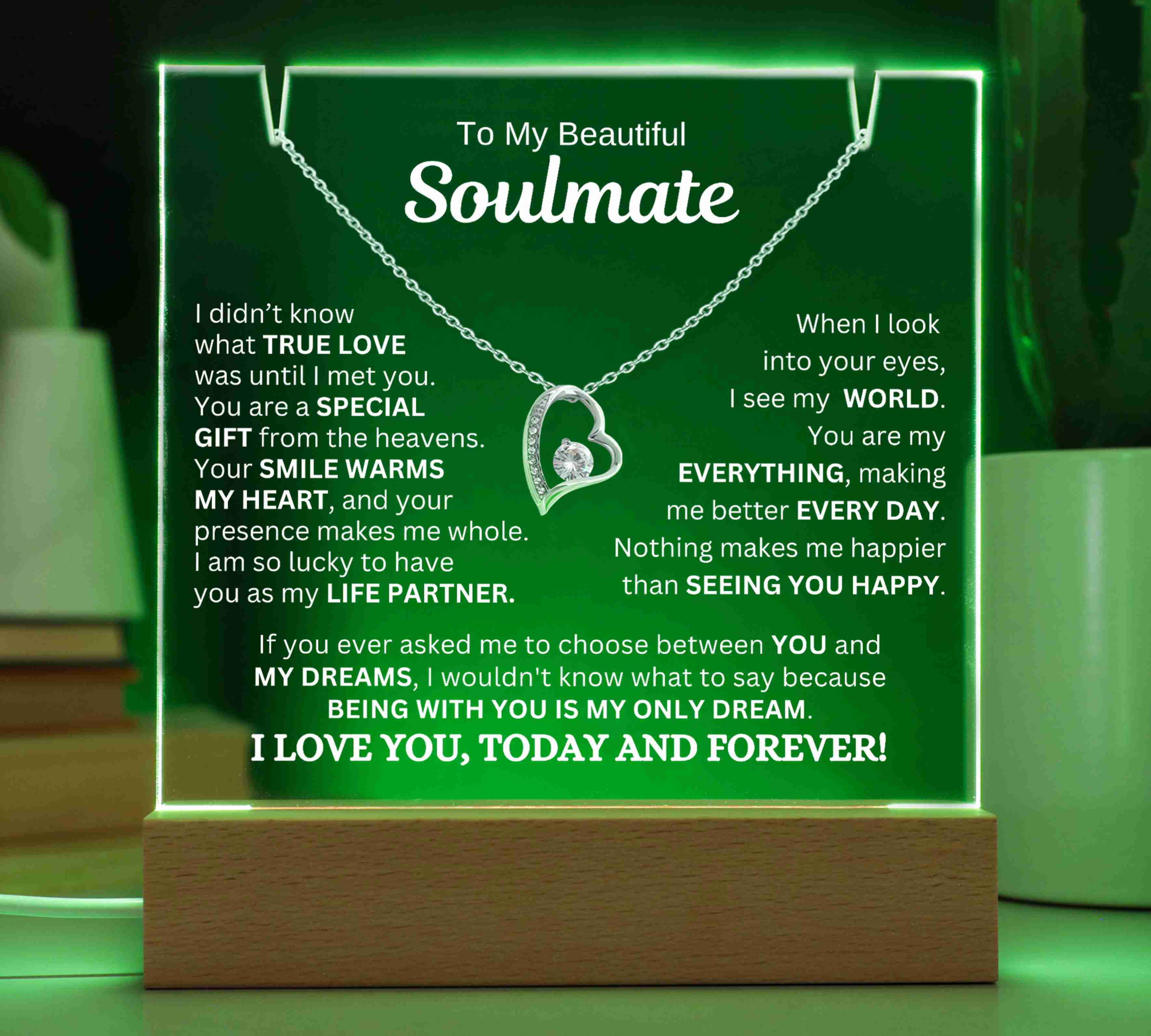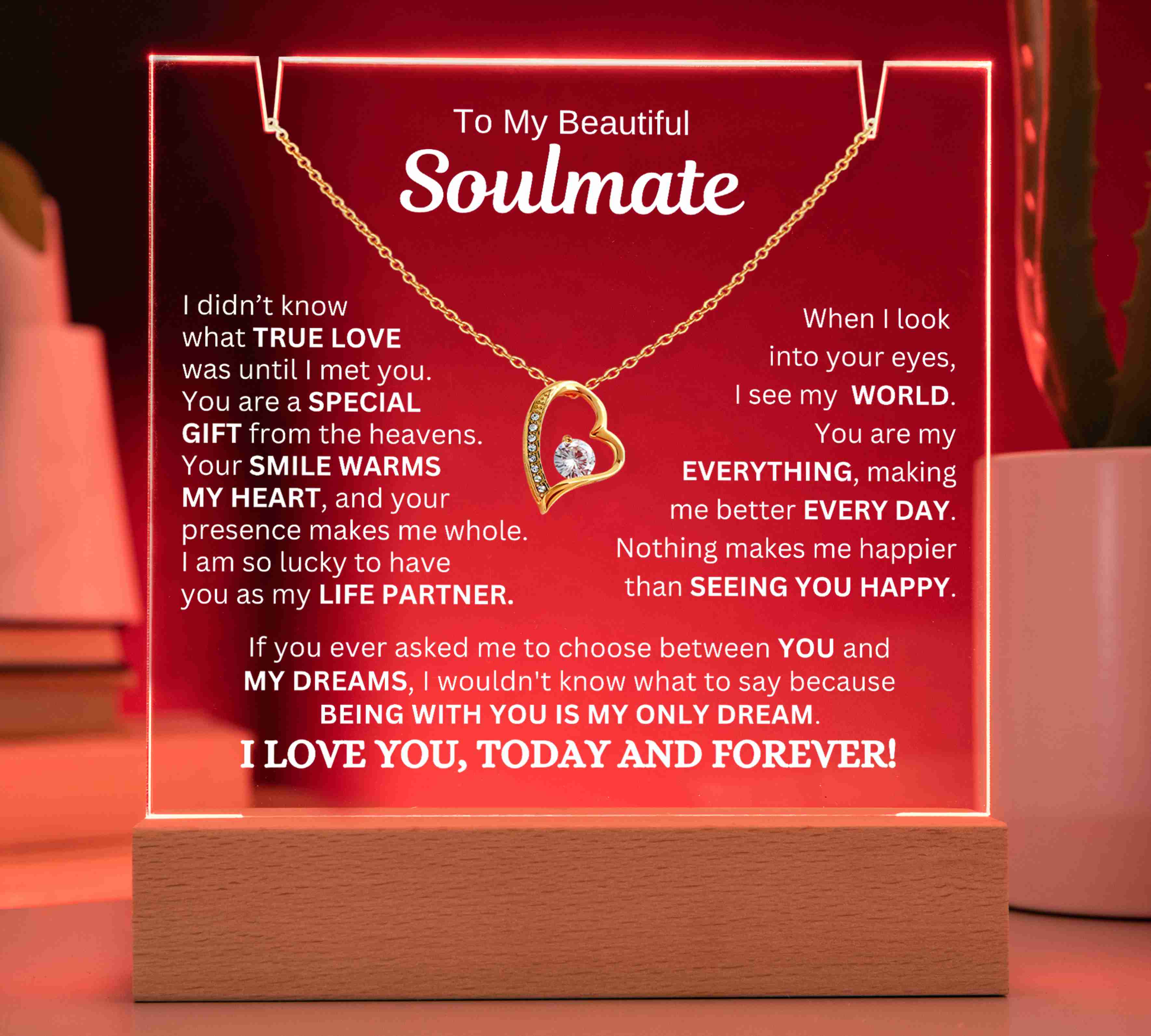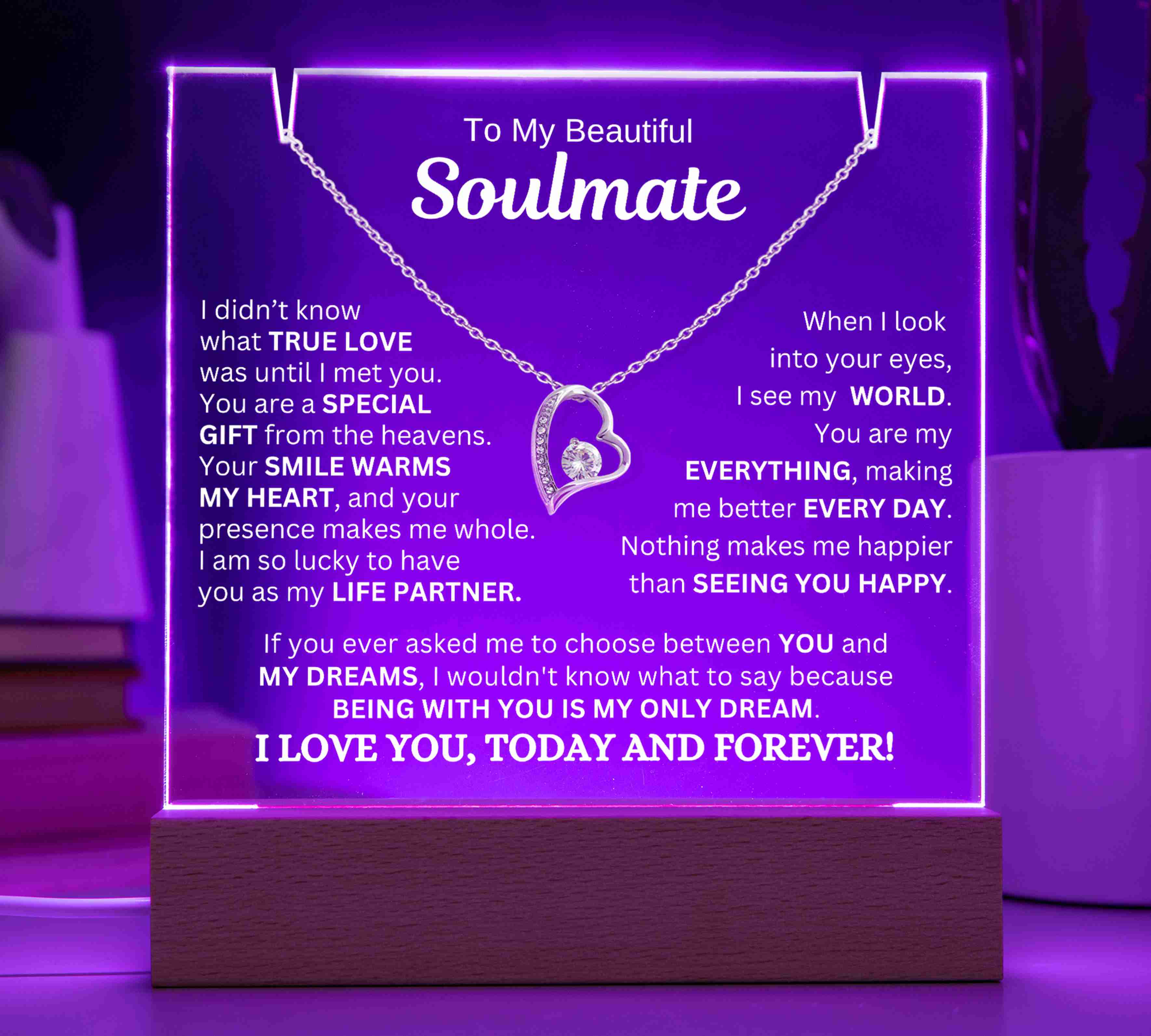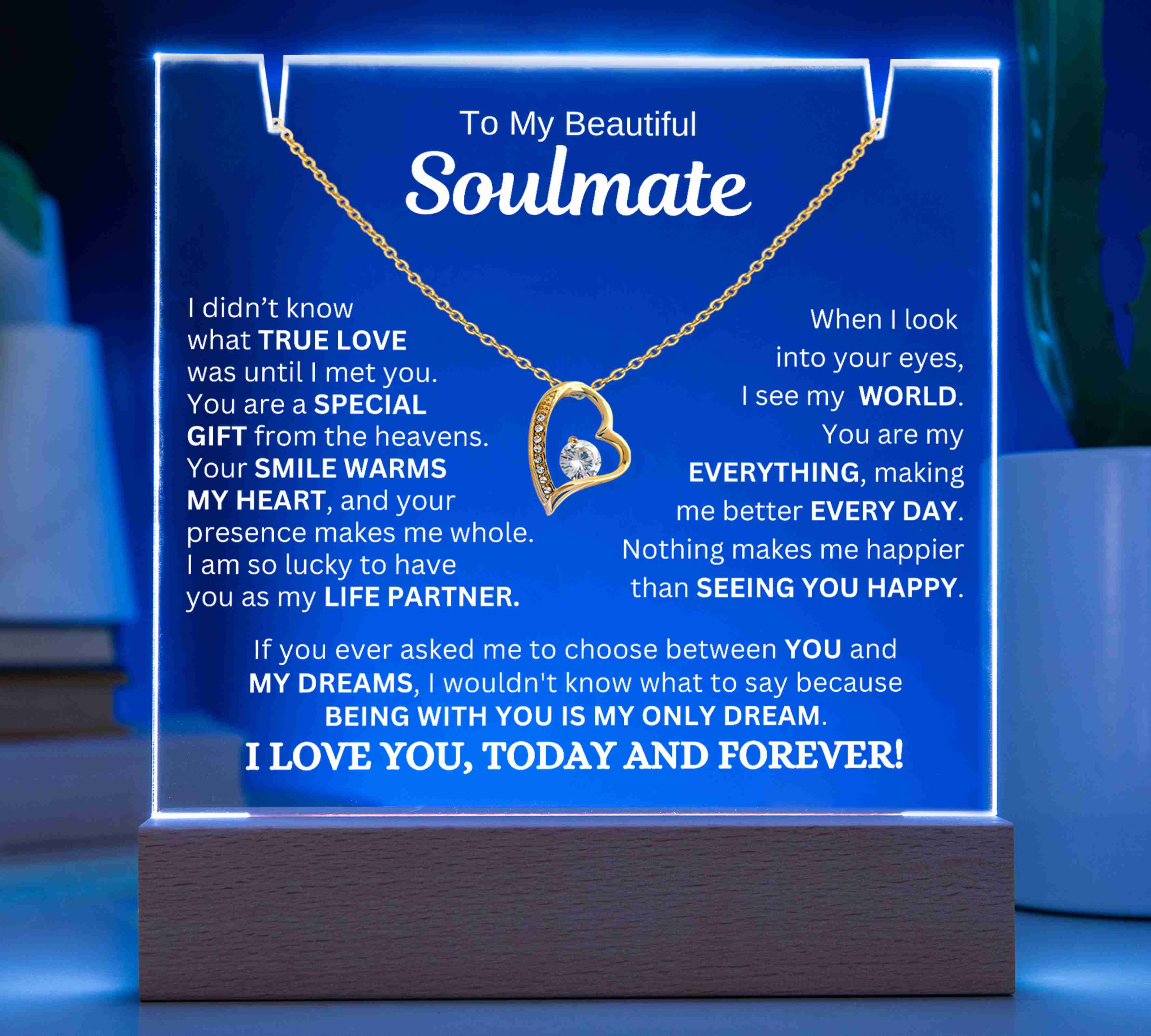 "TO MY SOULMATE, I DIDN’T KNOW WHAT TRUE LOVE WAS UNTIL I MET YOU. YOU ARE A SPECIAL GIFT FROM THE HEAVENS. YOUR SMILE WARMS MY HEART, AND YOUR PRESENCE MAKES ME WHOLE. I AM SO LUCKY TO HAVE YOU AS MY LIFE PARTNER. WHEN I LOOK INTO YOUR EYES, I SEE MY WORLD. YOU ARE MY EVERYTHING, AND YOU MAKE ME BETTER EVERY DAY. NOTHING MAKES ME HAPPIER THAN SEEING YOU SMILE. IF YOU EVER ASKED ME TO CHOOSE BETWEEN YOU AND MY DREAMS, I WOULDN'T KNOW WHAT TO SAY BECAUSE BEING WITH YOU IS MY ONLY DREAM. I LOVE YOU, TODAY AND FOREVER!"