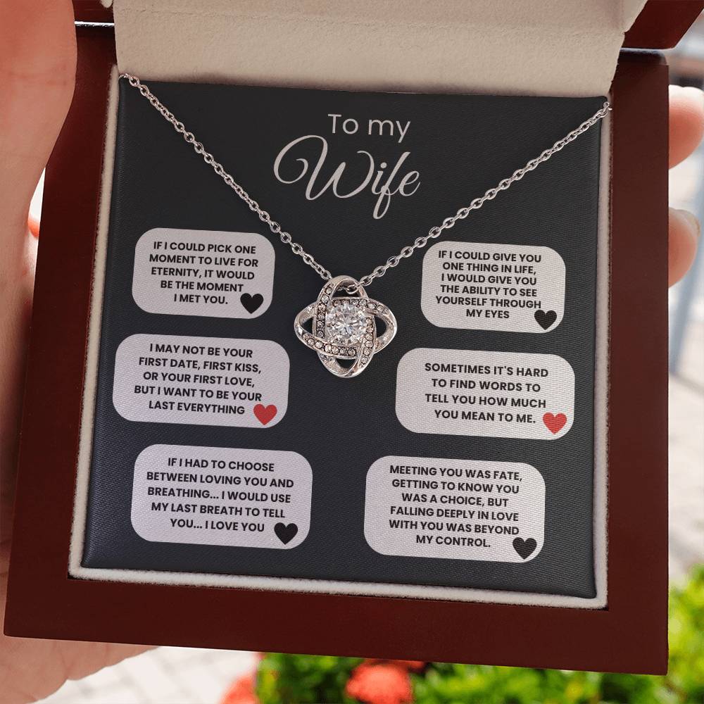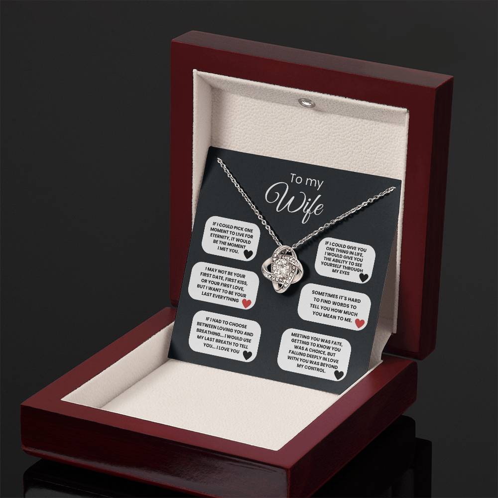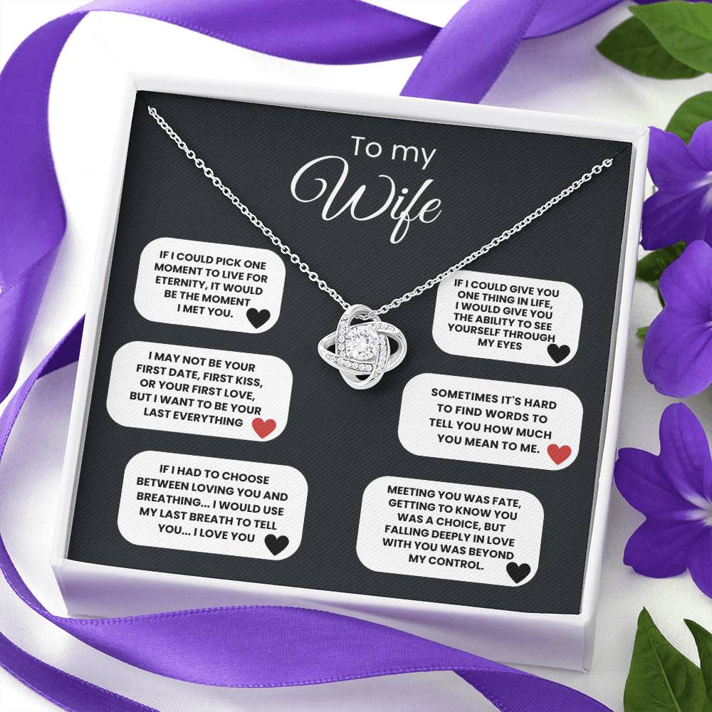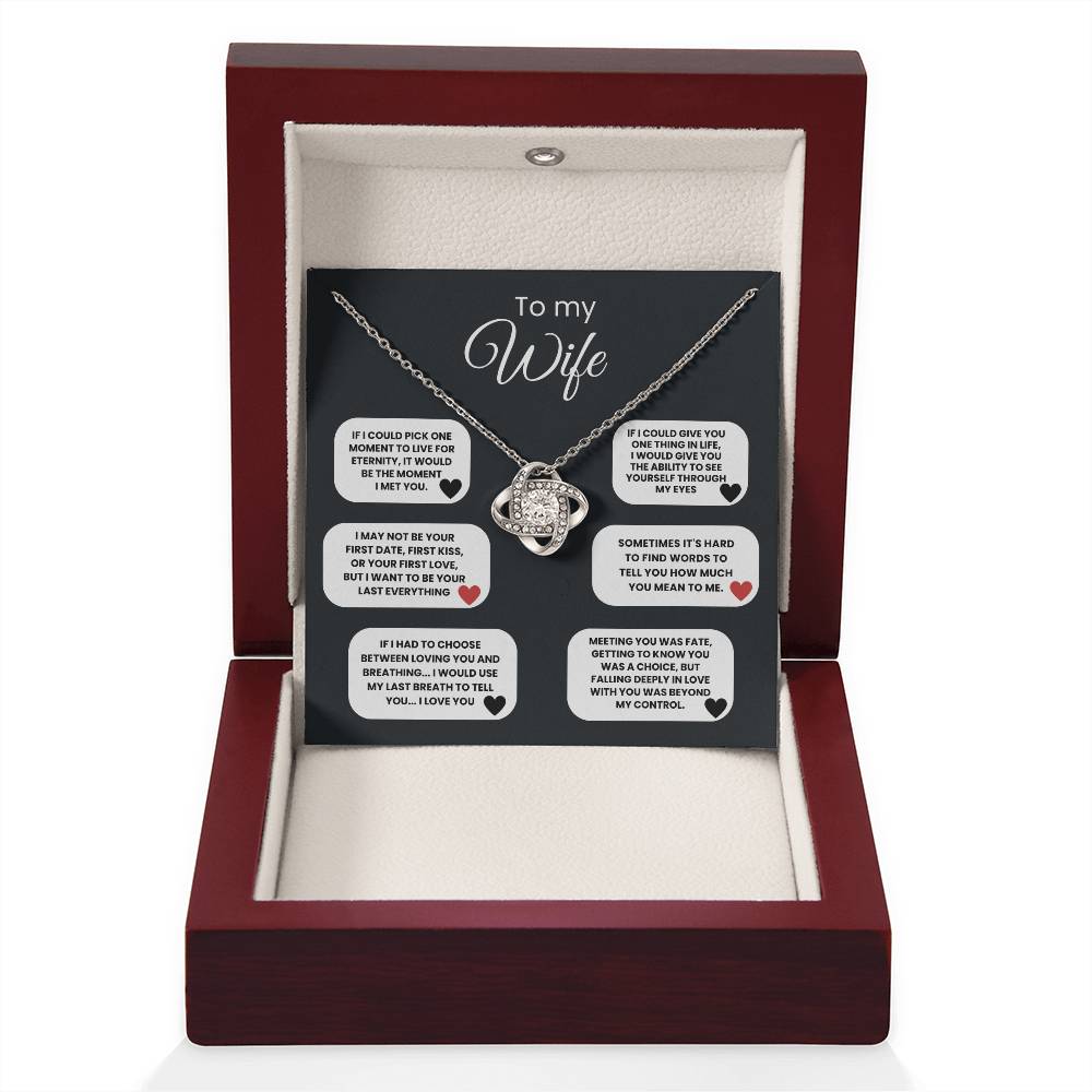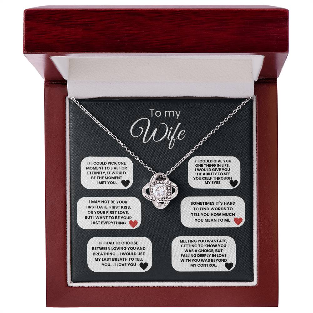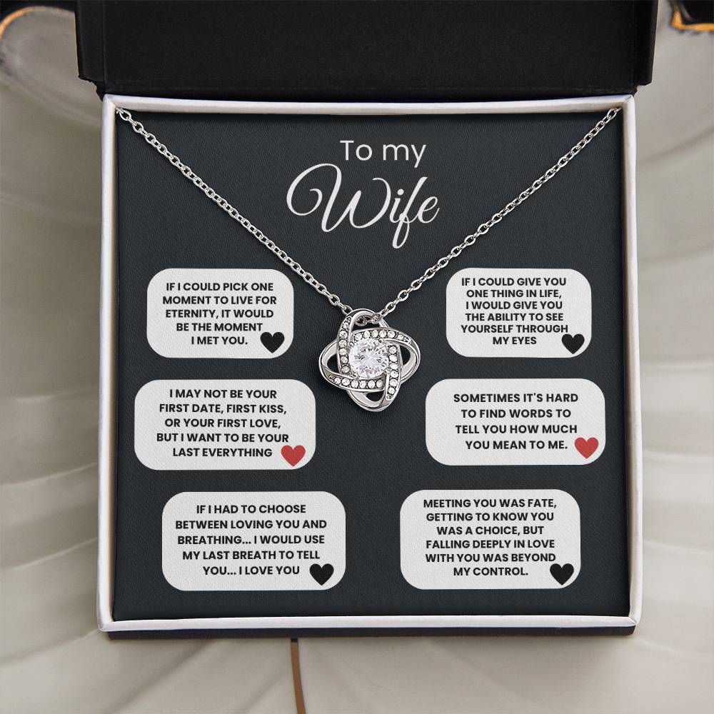 TO MY WIFE, IF I COULD PICK ONE MOMENT TO LIVE FOR ETERNITY, IT WOULD BE THE MOMENT I MET YOU. IF I COULD GIVE YOU ONE THING IN LIFE, I WOULD GIVE YOU THE ABILITY TO SEE YOURSELF THROUGH MY EYES. I MAY NOT BE YOUR FIRST DATE, FIRST KISS, OR YOUR FIRST LOVE, BUT I WANT TO BE YOUR LAST EVERYTHING. SOMETIMES IT'S HARD TO FIND WORDS TO TELL YOU HOW MUCH YOU MEAN TO ME. IF I HAD TO CHOOSE BETWEEN LOVING YOU AND BREATHING... I WOULD USE MY LAST BREATH TO TELL YOU... I LOVE YOU. MEETING YOU WAS FATE, GETTING TO KNOW YOU WAS A CHOICE, BUT FALLING DEEPLY IN LOVE WITH YOU WAS BEYOND MY CONTROL.