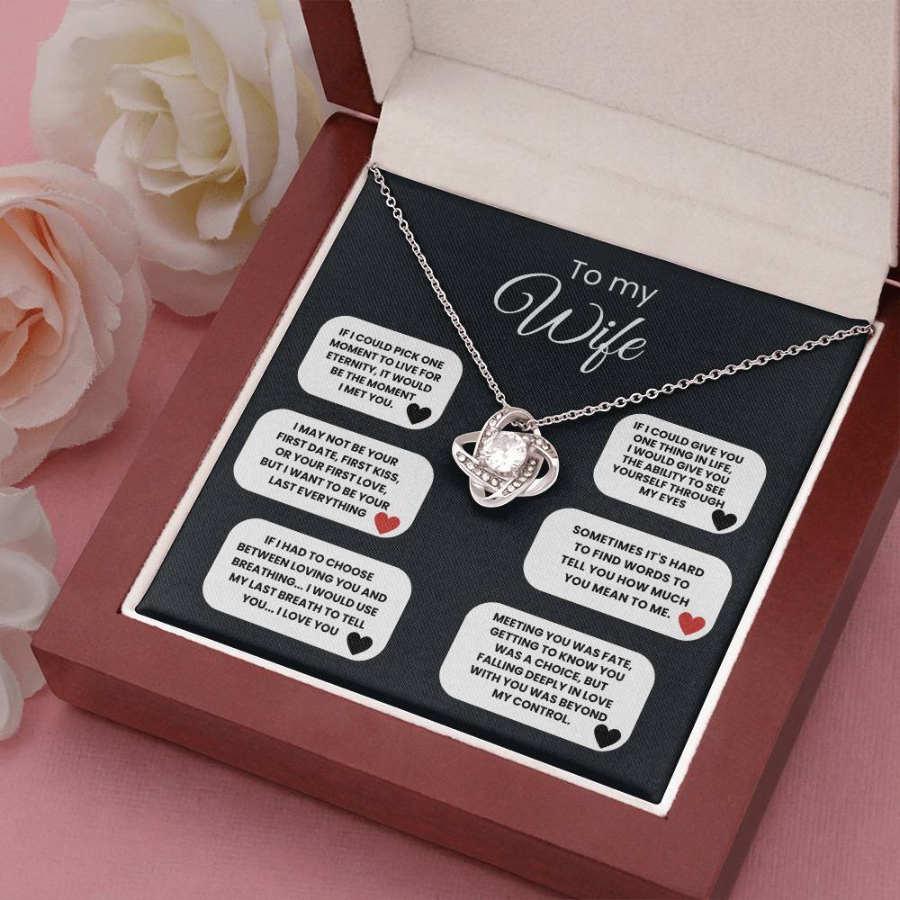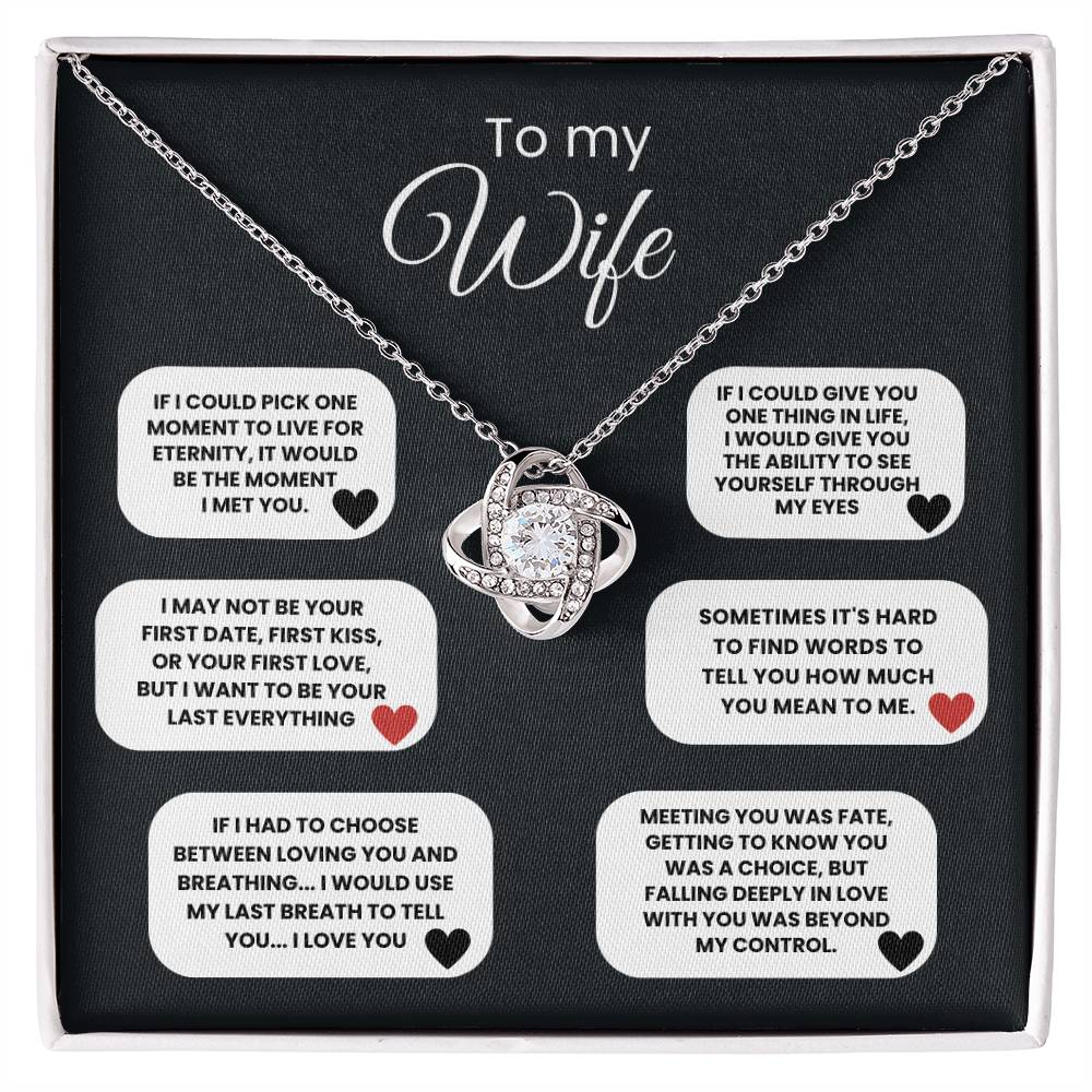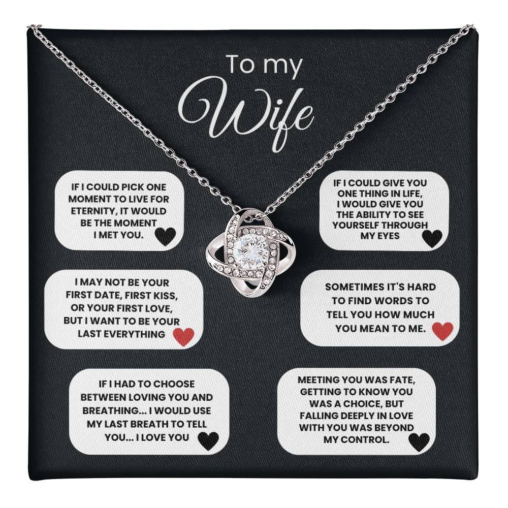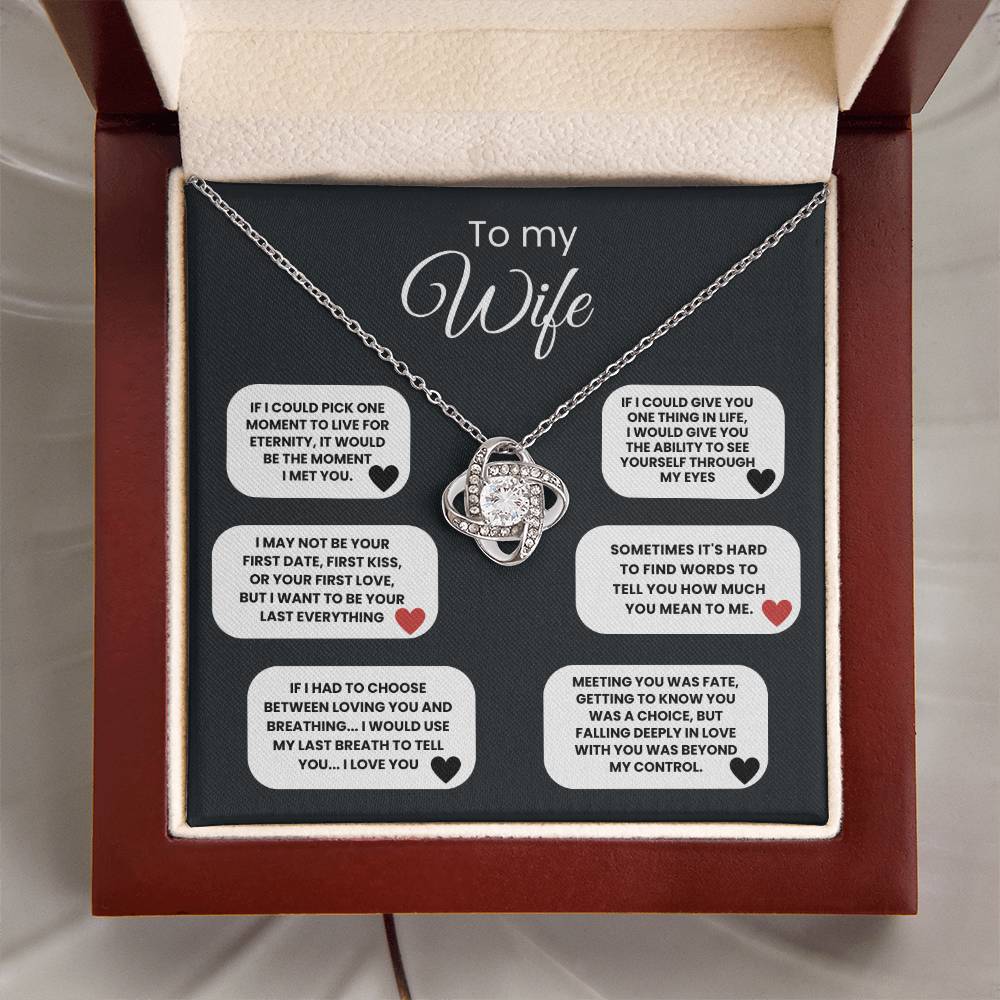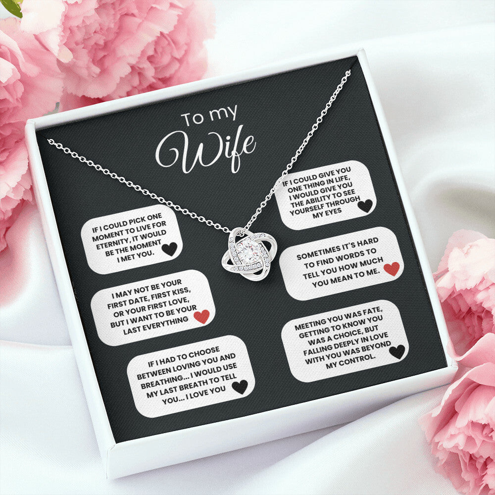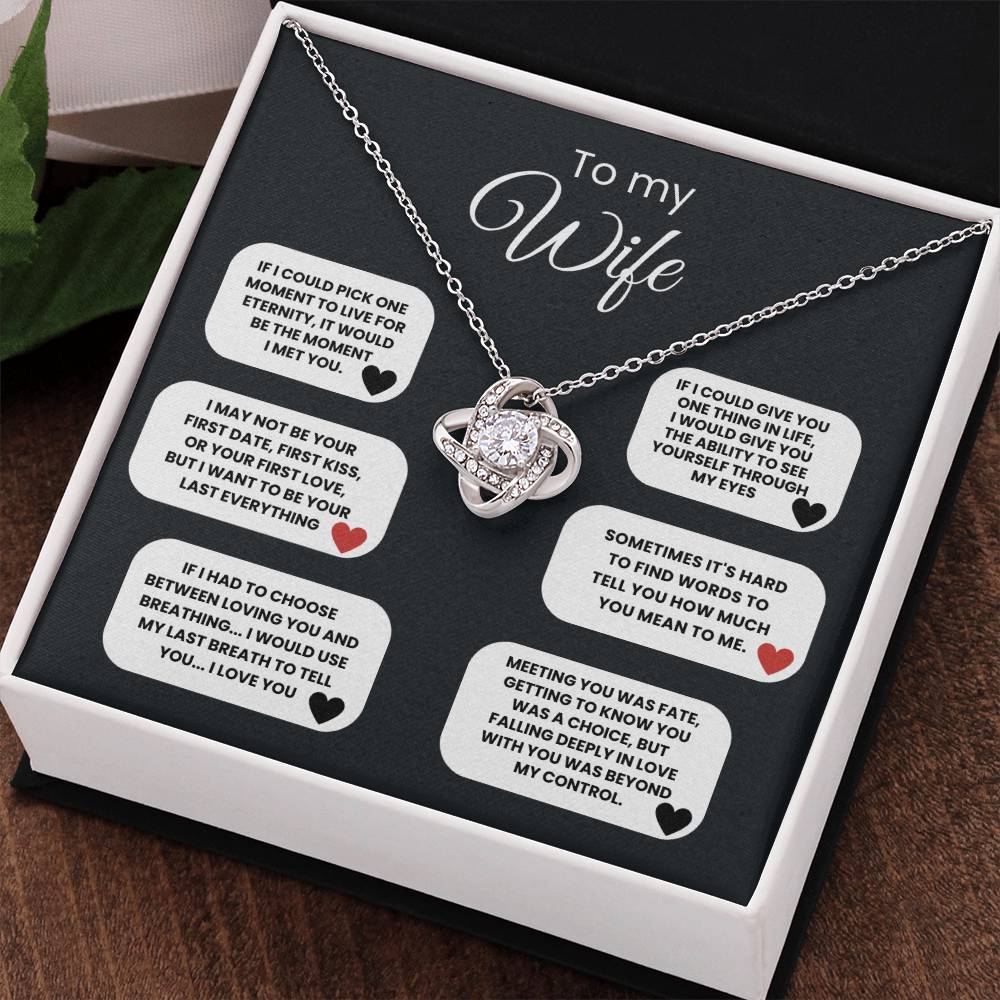 TO MY WIFE, IF I COULD PICK ONE MOMENT TO LIVE FOR ETERNITY, IT WOULD BE THE MOMENT I MET YOU. IF I COULD GIVE YOU ONE THING IN LIFE, I WOULD GIVE YOU THE ABILITY TO SEE YOURSELF THROUGH MY EYES. I MAY NOT BE YOUR FIRST DATE, FIRST KISS, OR YOUR FIRST LOVE, BUT I WANT TO BE YOUR LAST EVERYTHING. SOMETIMES IT'S HARD TO FIND WORDS TO TELL YOU HOW MUCH YOU MEAN TO ME. IF I HAD TO CHOOSE BETWEEN LOVING YOU AND BREATHING... I WOULD USE MY LAST BREATH TO TELL YOU... I LOVE YOU. MEETING YOU WAS FATE, GETTING TO KNOW YOU WAS A CHOICE, BUT FALLING DEEPLY IN LOVE WITH YOU WAS BEYOND MY CONTROL.