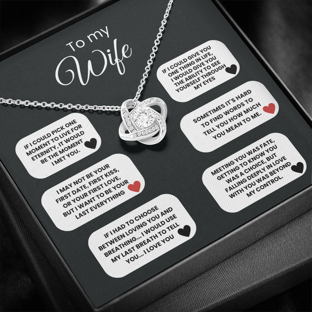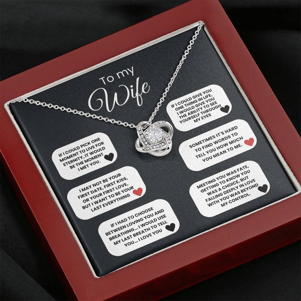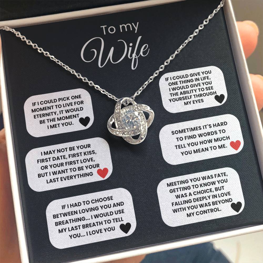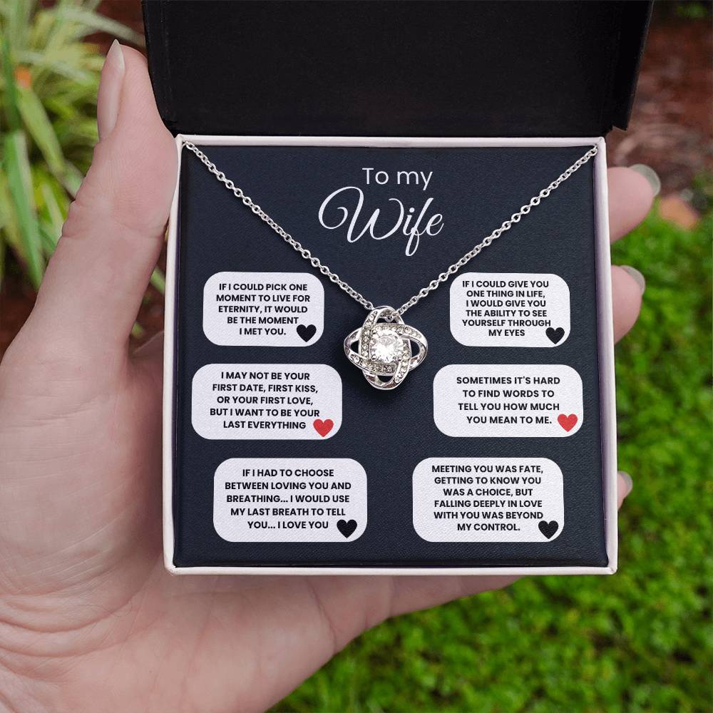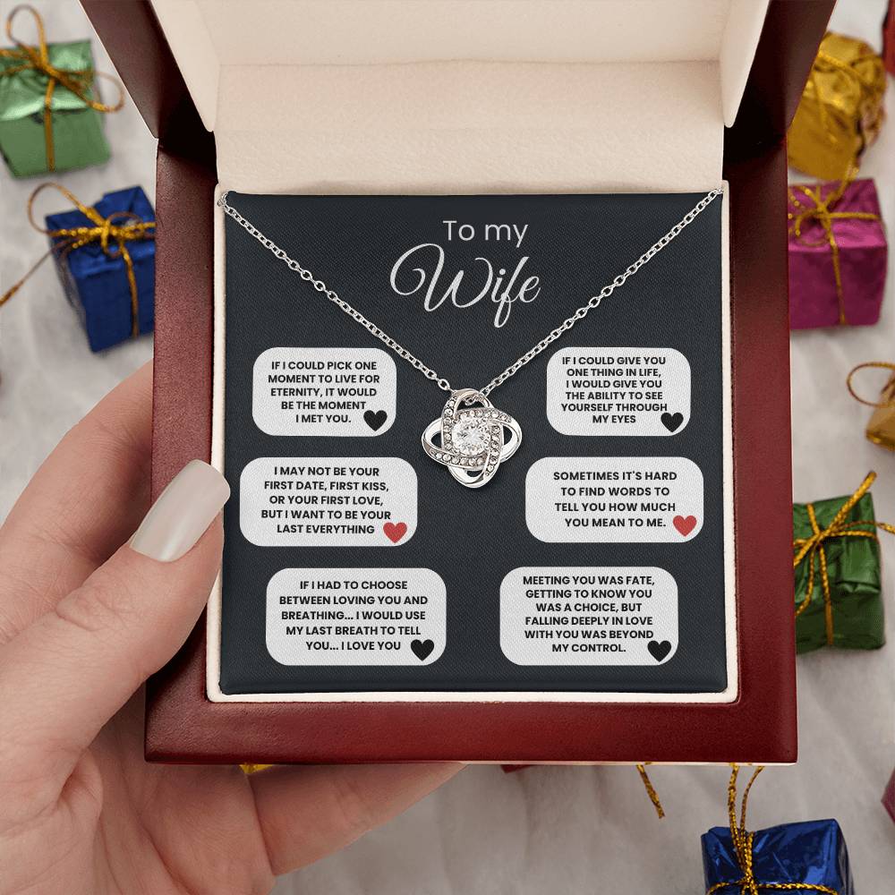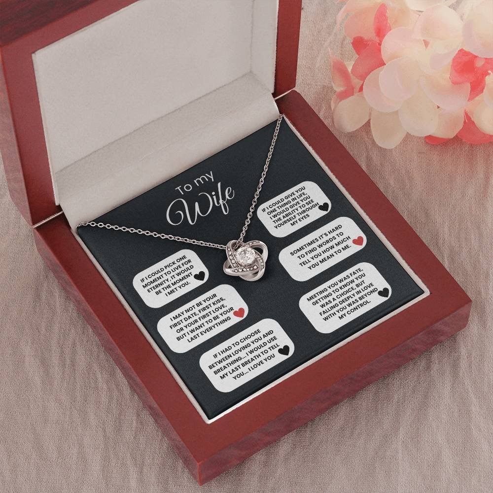 TO MY WIFE, IF I COULD PICK ONE MOMENT TO LIVE FOR ETERNITY, IT WOULD BE THE MOMENT I MET YOU. IF I COULD GIVE YOU ONE THING IN LIFE, I WOULD GIVE YOU THE ABILITY TO SEE YOURSELF THROUGH MY EYES. I MAY NOT BE YOUR FIRST DATE, FIRST KISS, OR YOUR FIRST LOVE, BUT I WANT TO BE YOUR LAST EVERYTHING. SOMETIMES IT'S HARD TO FIND WORDS TO TELL YOU HOW MUCH YOU MEAN TO ME. IF I HAD TO CHOOSE BETWEEN LOVING YOU AND BREATHING... I WOULD USE MY LAST BREATH TO TELL YOU... I LOVE YOU. MEETING YOU WAS FATE, GETTING TO KNOW YOU WAS A CHOICE, BUT FALLING DEEPLY IN LOVE WITH YOU WAS BEYOND MY CONTROL.