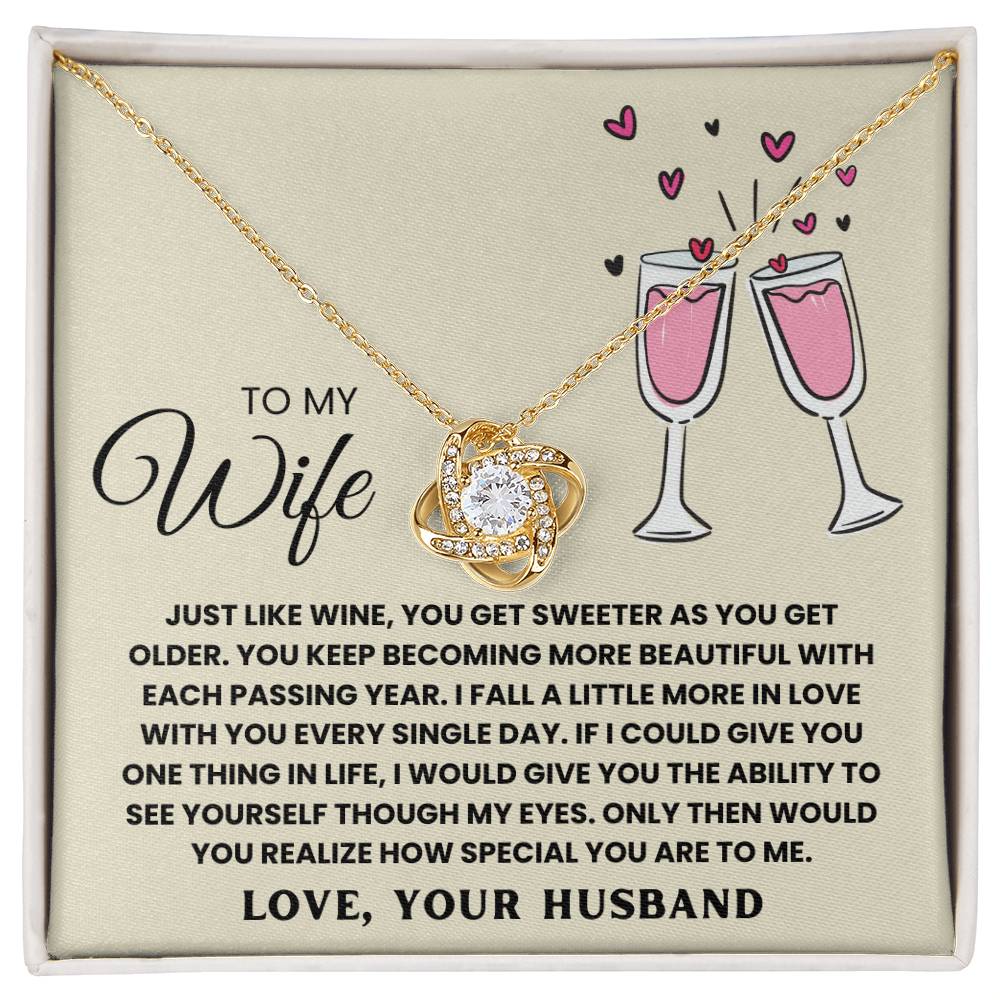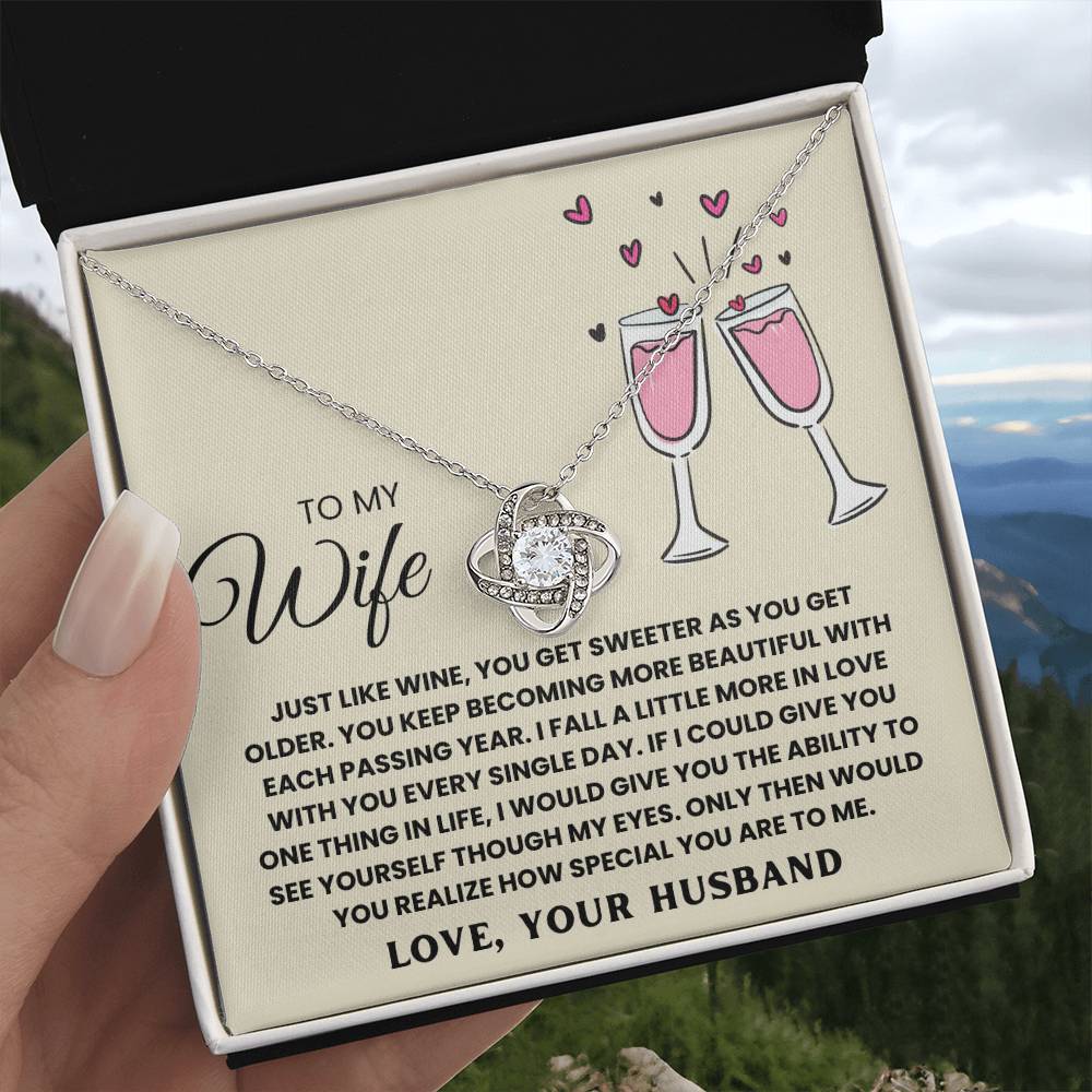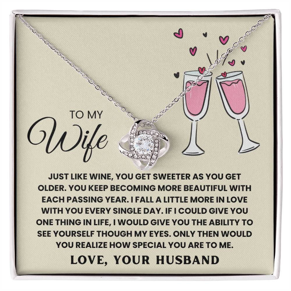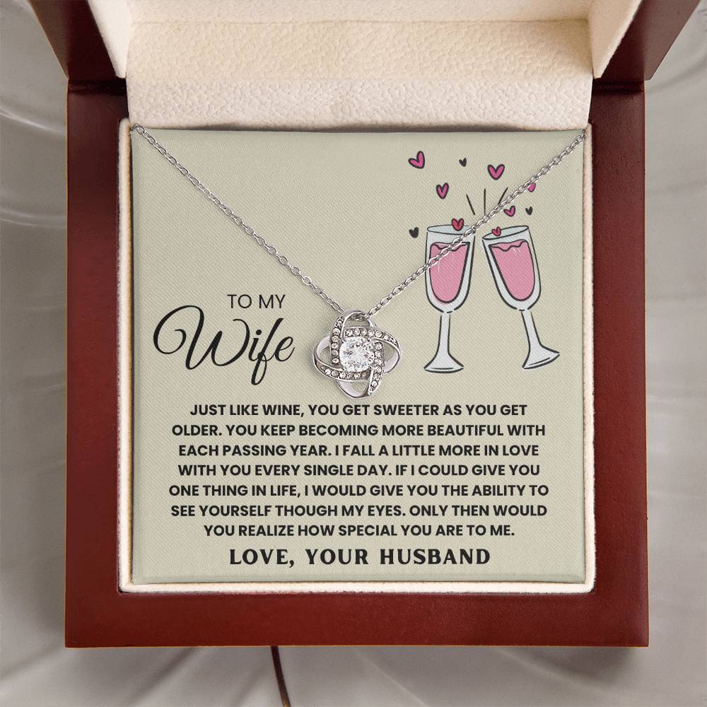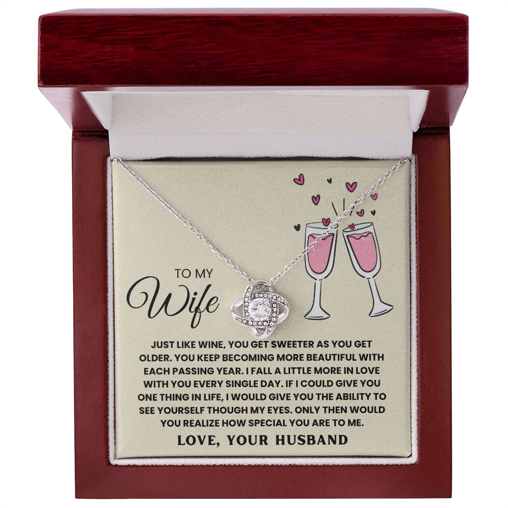 TO MY WIFE, JUST LIKE WINE, YOU GET SWEETER AS YOU GET OLDER. YOU KEEP  BECOMING MORE BEAUTIFUL WITH EACH PASSING YEAR. I FALL A LITTLE MORE IN LOVE WITH YOU EVERY SINGLE DAY. IF I COULD GIVE YOU ONE THING IN LIfe, I WOULD GIVE YOU THE ABILITY TO SEE YOURSELF THOUGH MY EYES. ONLY THEN WOULD YOU REALIZE HOW SPECIAL YOU ARE TO ME. LOVE, YOUR HUSBAND