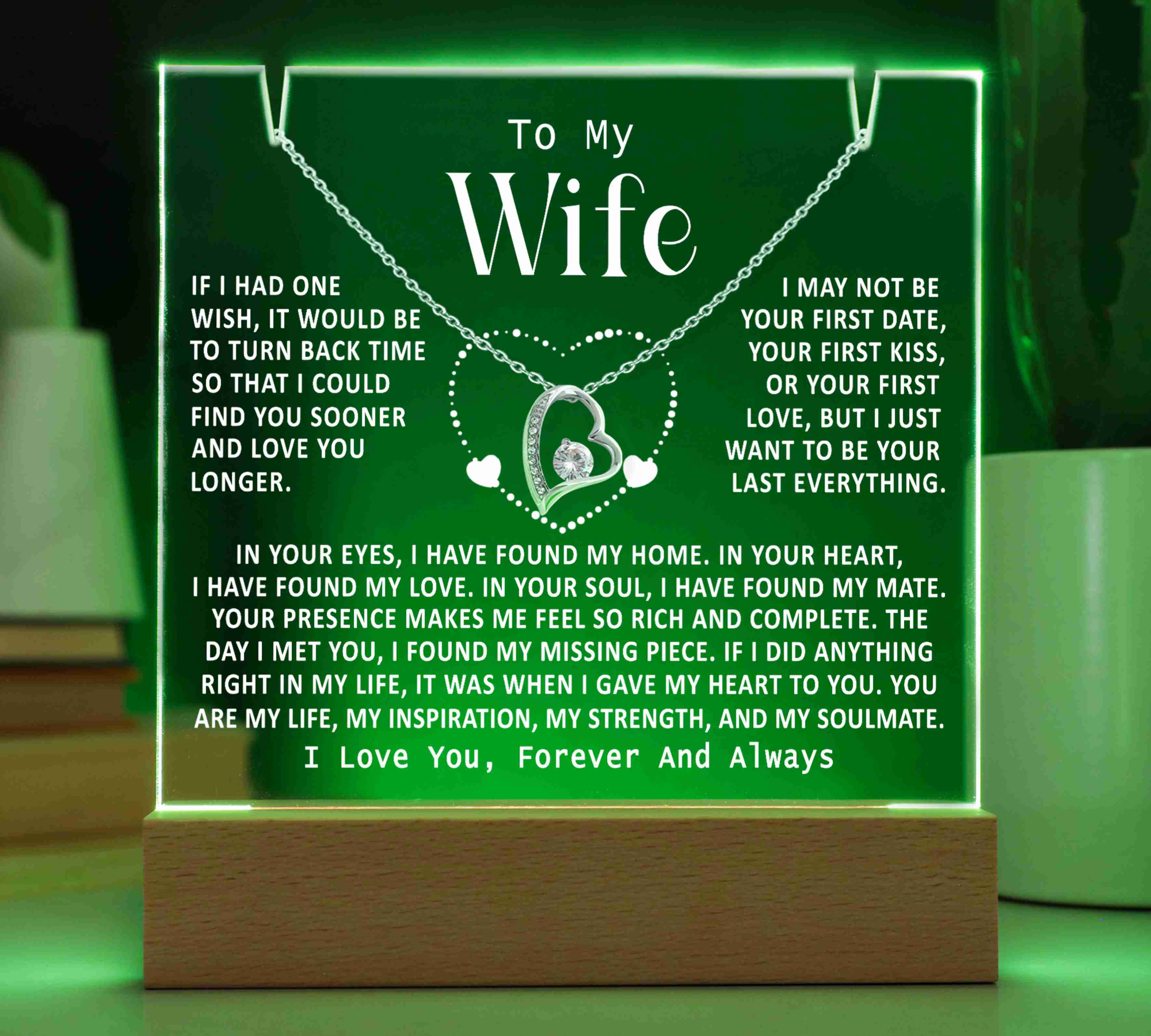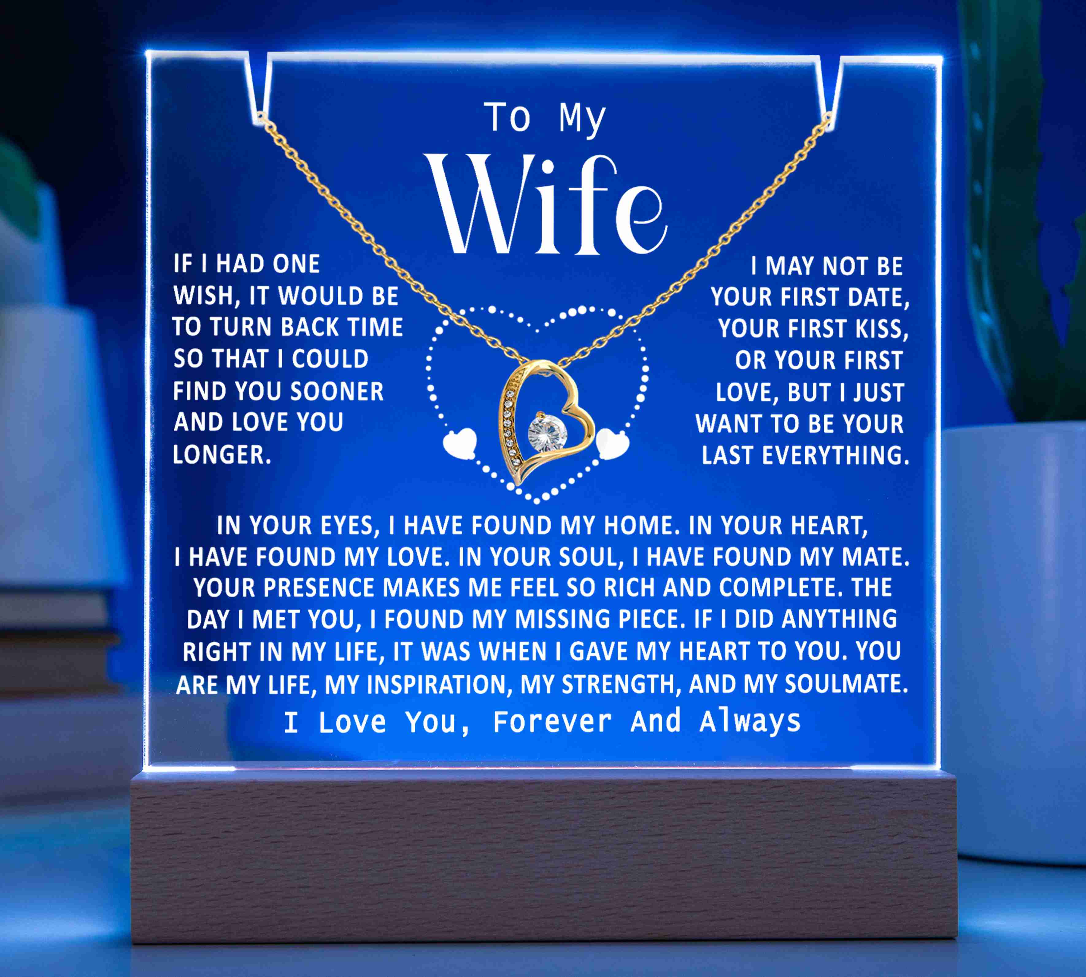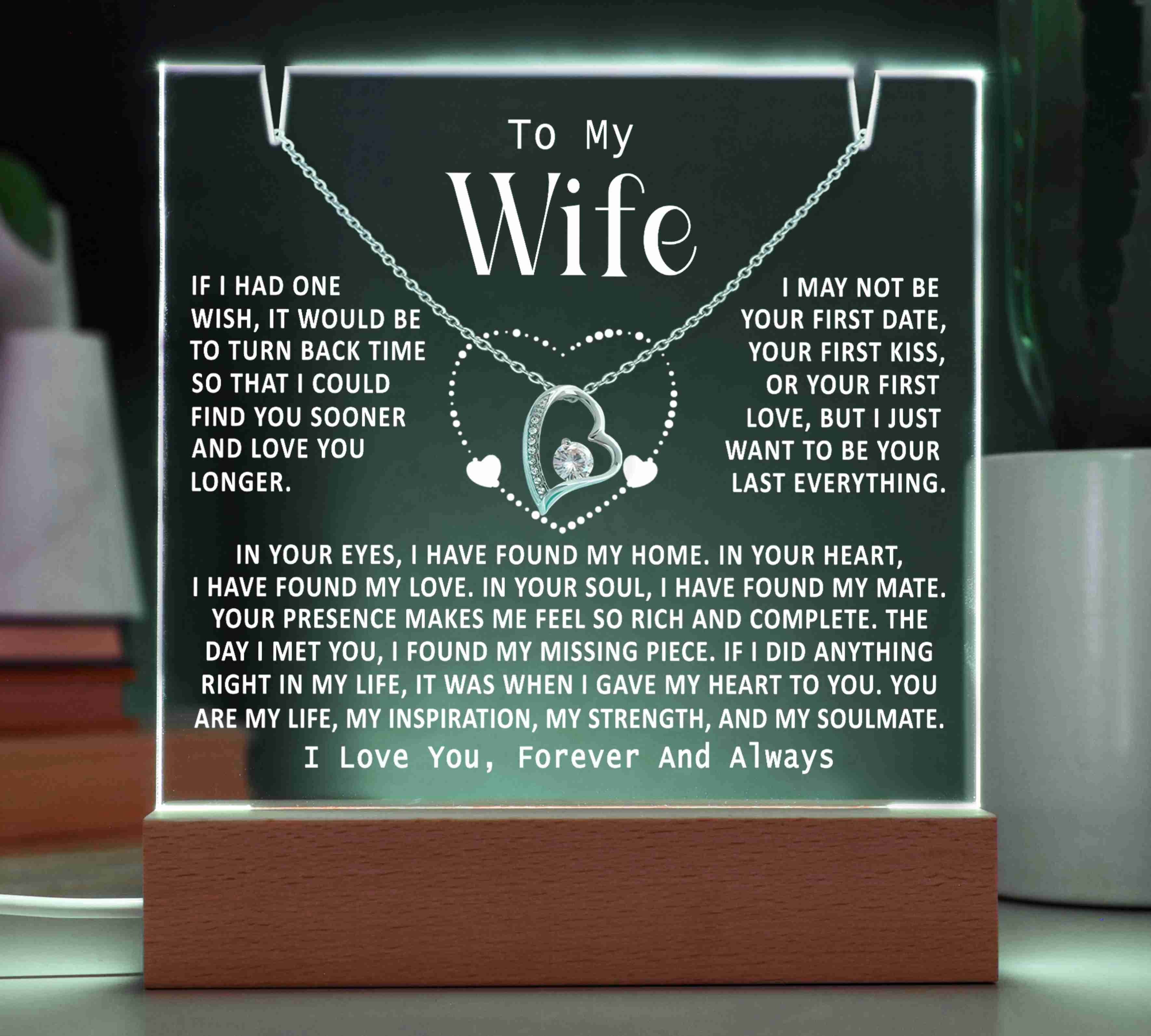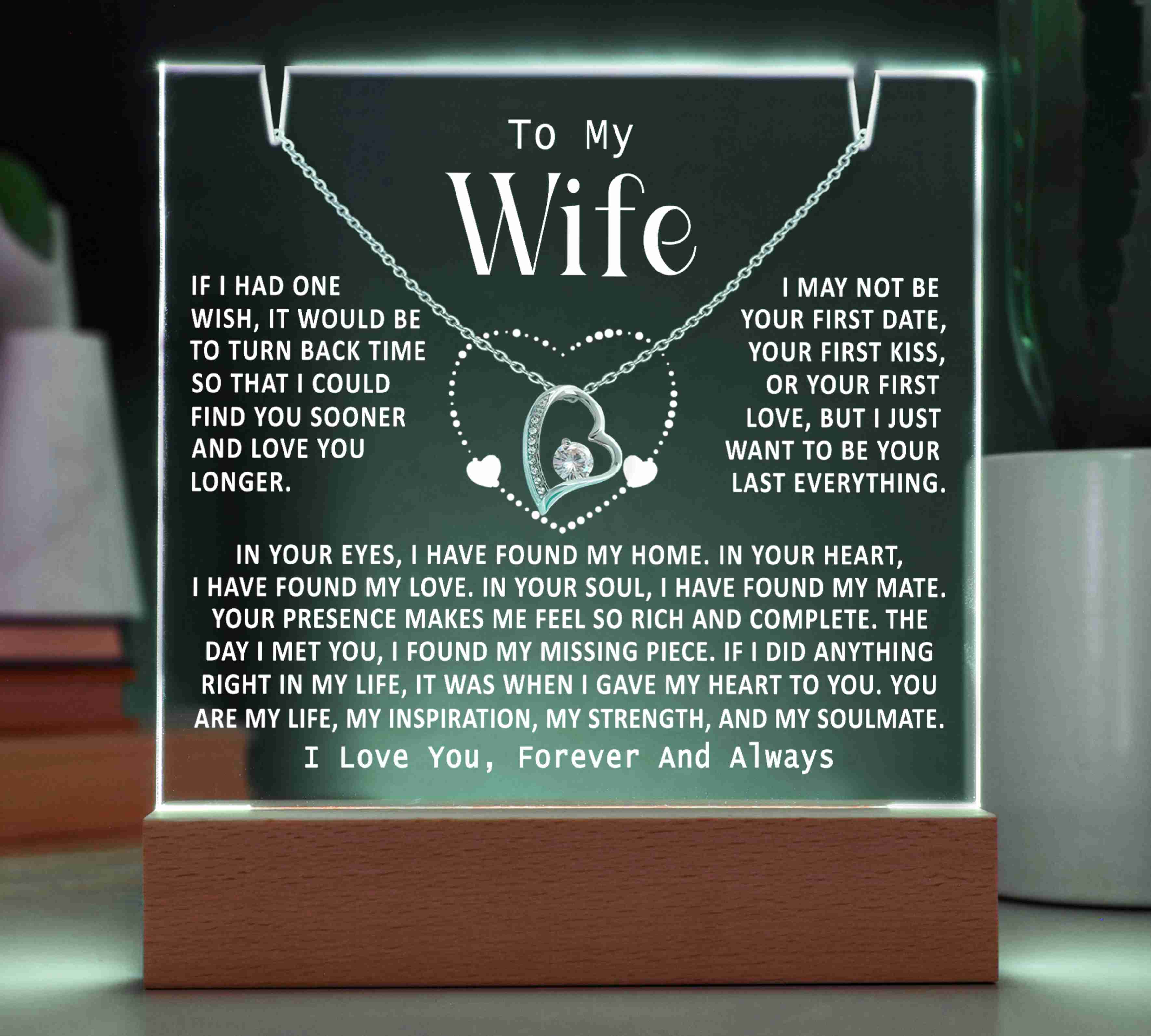 "TO MY WIFE, IF I HAD ONE WISH, IT WOULD BE TO TURN BACK TIME SO THAT I COULD FIND YOU SOONER AND LOVE YOU LONGER. I MAY NOT BE YOUR FIRST DATE, YOUR FIRST KISS, OR YOUR FIRST LOVE, BUT I JUST WANT TO BE YOUR LAST EVERYTHING. IN YOUR EYES I HAVE FOUND MY HOME, IN YOUR HEART I HAVE FOUND MY LOVE, IN YOUR SOUL I HAVE FOUND MY MATE. YOUR PRESENCE MAKES ME FEEL SO RICH AND COMPLETE. THE DAY I MET YOU I FOUND MY MISSING PIECE. IF I DID ANYTHING RIGHT IN MY LIFE, IT WAS WHEN I GAVE MY HEART TO YOU. YOU ARE MY LIFE, MY INSPIRATION, MY STRENGTH, AND MY SOULMATE. I LOVE YOU, FOREVER AND ALWAYS."