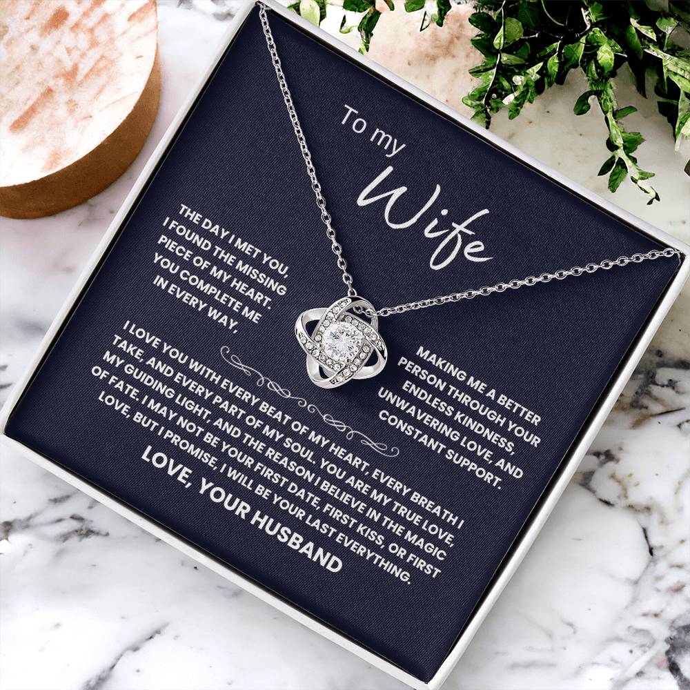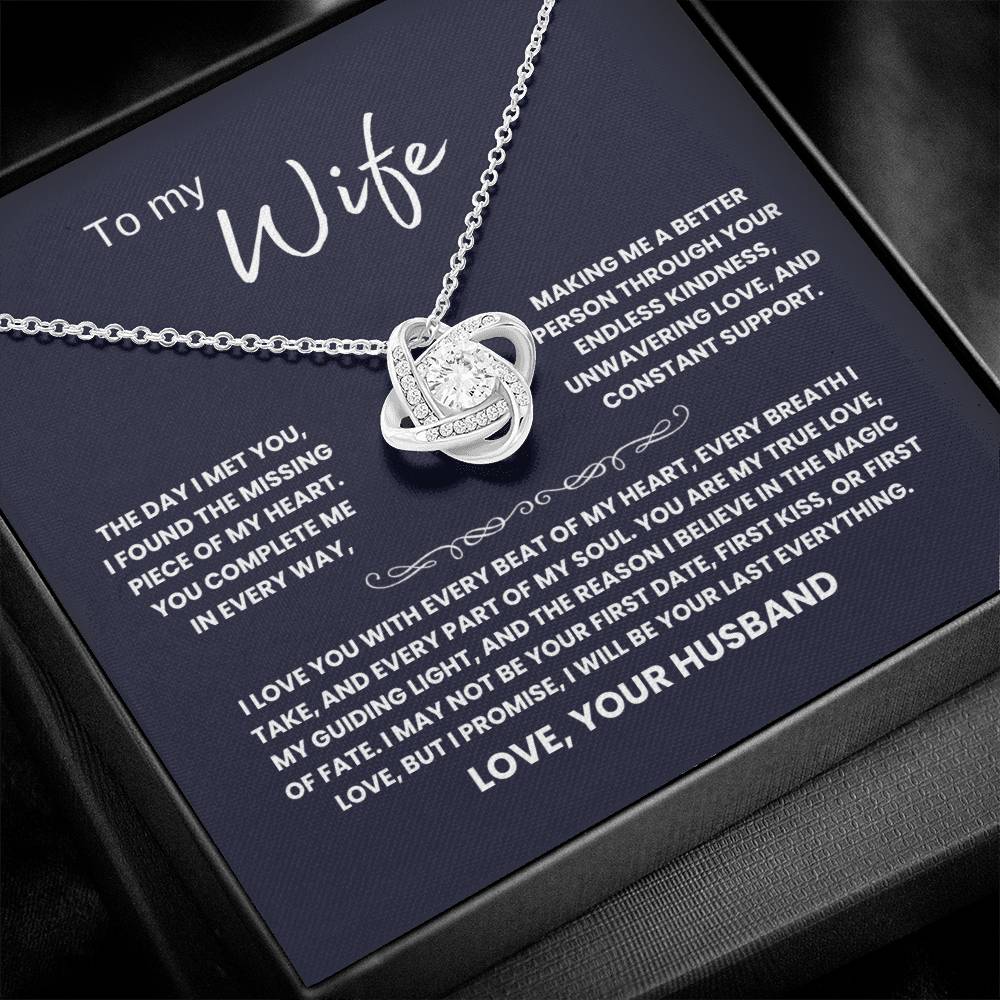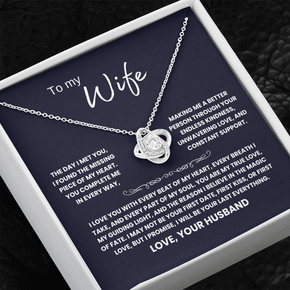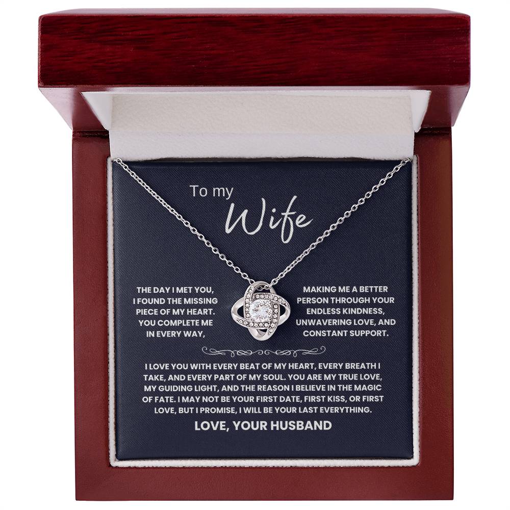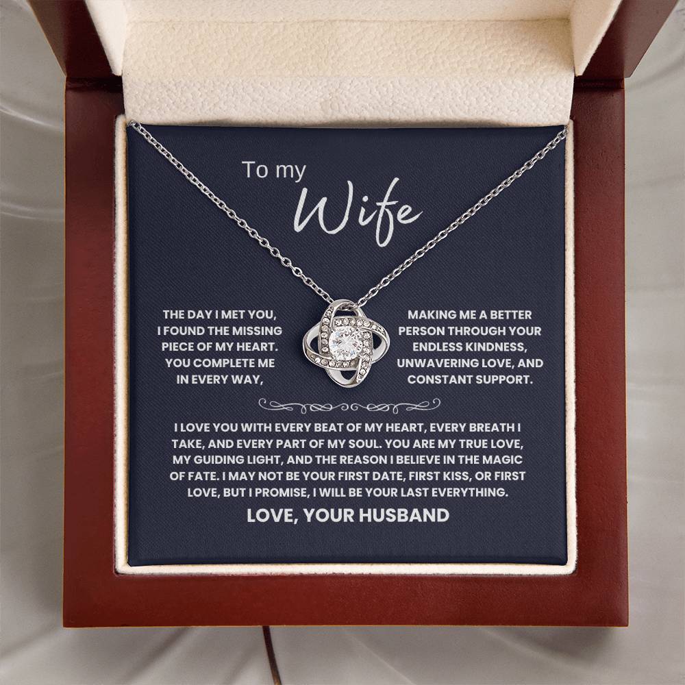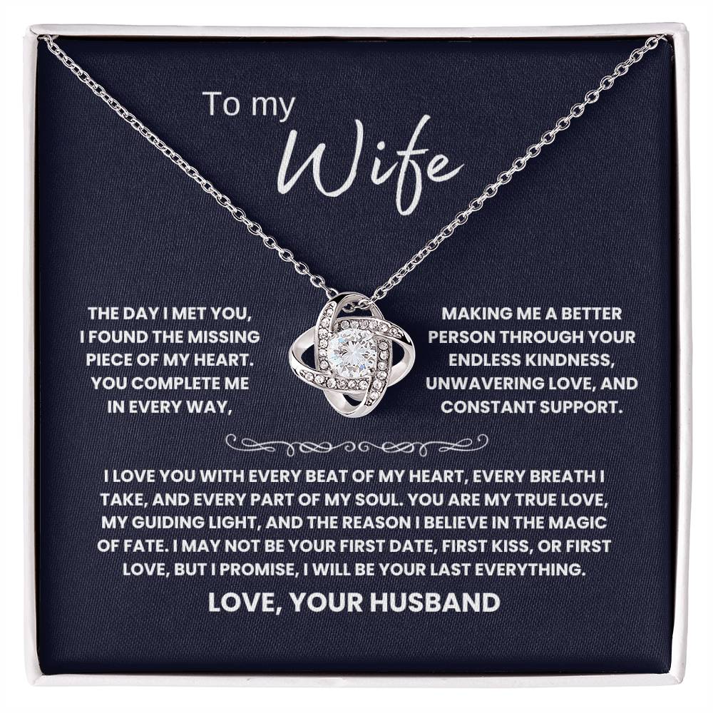 TO MY WIFE, THE DAY I MET YOU, I FOUND THE MISSING PIECE OF MY HEART. YOU COMPLETE ME IN EVERY WAY, MAKING ME A BETTER PERSON THROUGH YOUR ENDLESS KINDNESS, UNWAVERING LOVE, AND CONSTANT SUPPORT. I LOVE YOU WITH EVERY BEAT OF MY HEART, EVERY BREATH I TAKE, AND EVERY PART OF MY SOUL. YOU ARE MY TRUE LOVE, MY GUIDING LIGHT, AND THE REASON I BELIEVE IN THE MAGIC OF FATE. I MAY NOT BE YOUR FIRST DATE, FIRST KISS, OR FIRST LOVE, BUT I PROMISE, I WILL BE YOUR LAST EVERYTHING. LOVE, YOUR HUSBAND