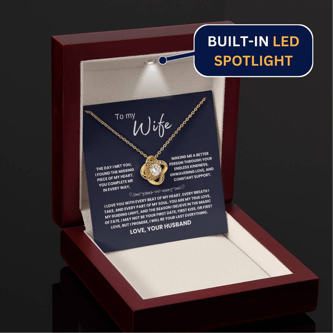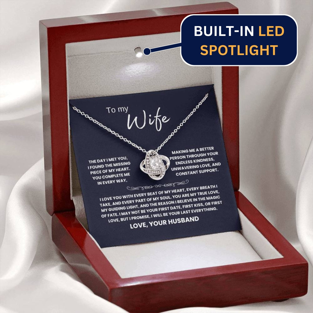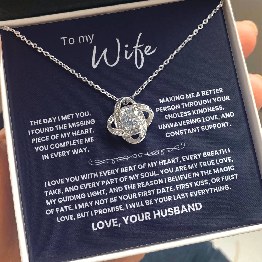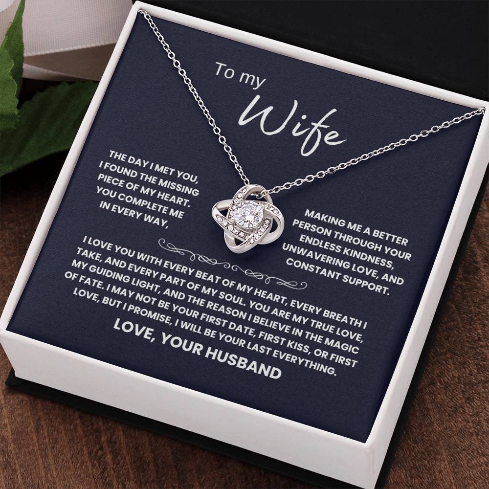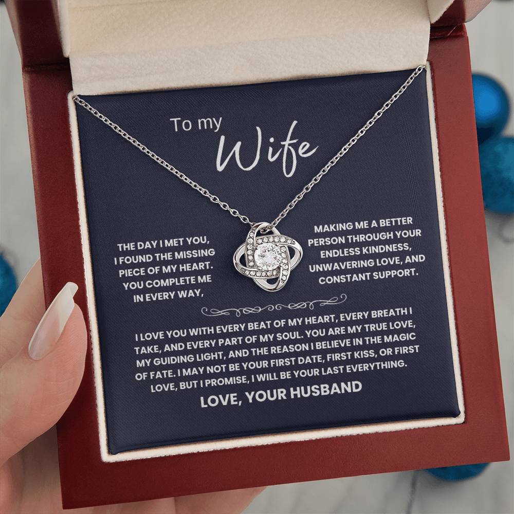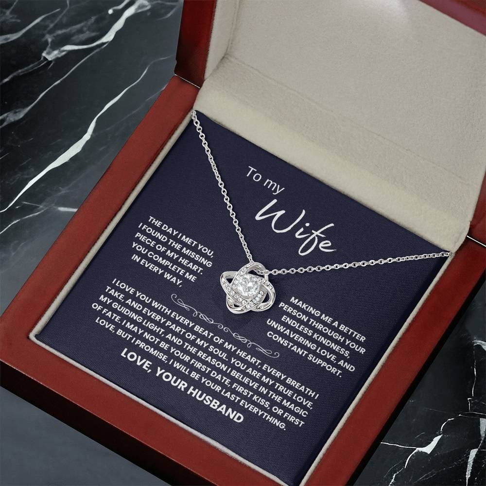 TO MY WIFE, THE DAY I MET YOU, I FOUND THE MISSING PIECE OF MY HEART. YOU COMPLETE ME IN EVERY WAY, MAKING ME A BETTER PERSON THROUGH YOUR ENDLESS KINDNESS, UNWAVERING LOVE, AND CONSTANT SUPPORT. I LOVE YOU WITH EVERY BEAT OF MY HEART, EVERY BREATH I TAKE, AND EVERY PART OF MY SOUL. YOU ARE MY TRUE LOVE, MY GUIDING LIGHT, AND THE REASON I BELIEVE IN THE MAGIC OF FATE. I MAY NOT BE YOUR FIRST DATE, FIRST KISS, OR FIRST LOVE, BUT I PROMISE, I WILL BE YOUR LAST EVERYTHING. LOVE, YOUR HUSBAND