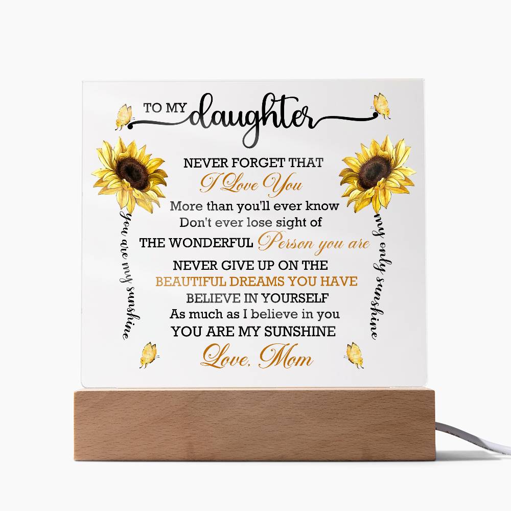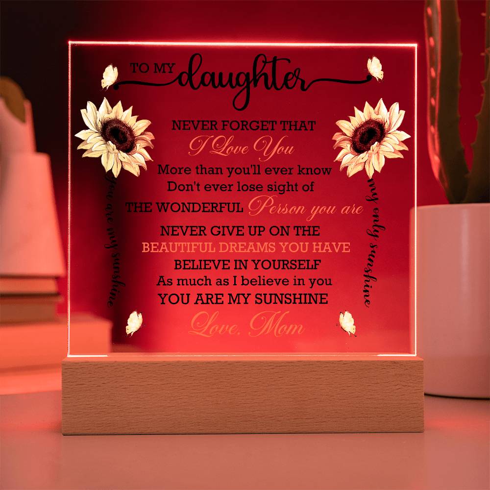 Your plaque will be crafted from premium acrylic with a professionally printed design for a polished look. It comes with a stylish wooden LED base, and you can choose between a USB plug-in option OR a cordless battery-operated option (requires 2 AAA batteries, not included). Both LED bases feature 7 vibrant colors, allowing the user to customize the lighting with various color changes and dynamic cycles.