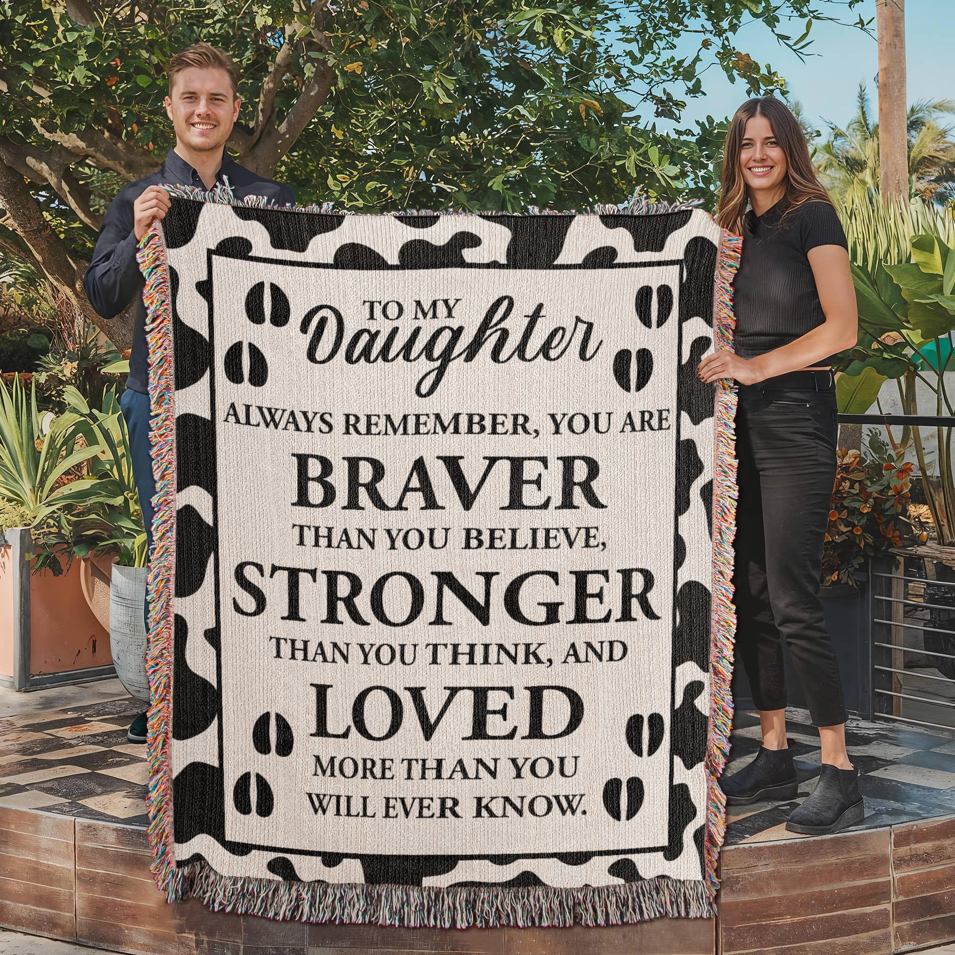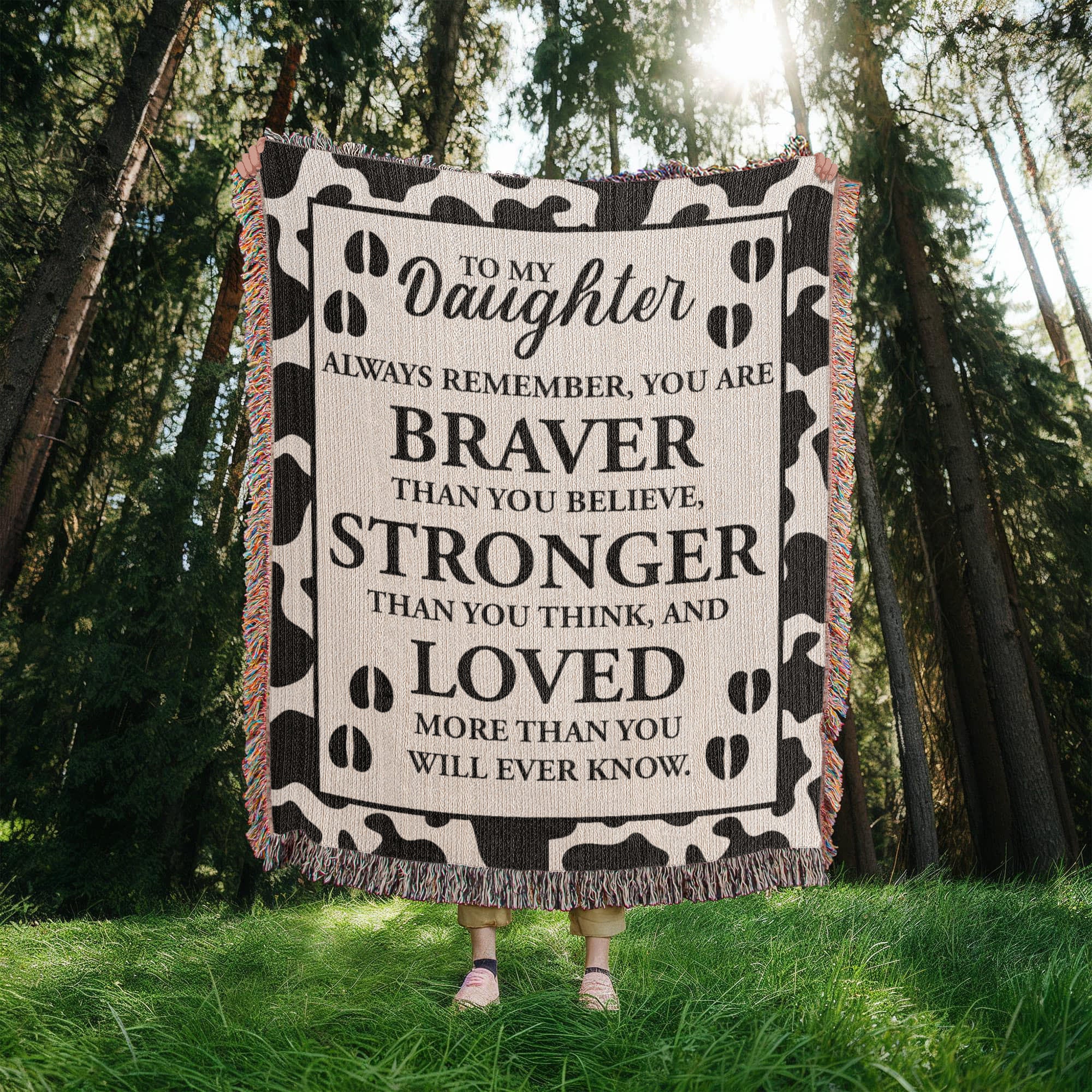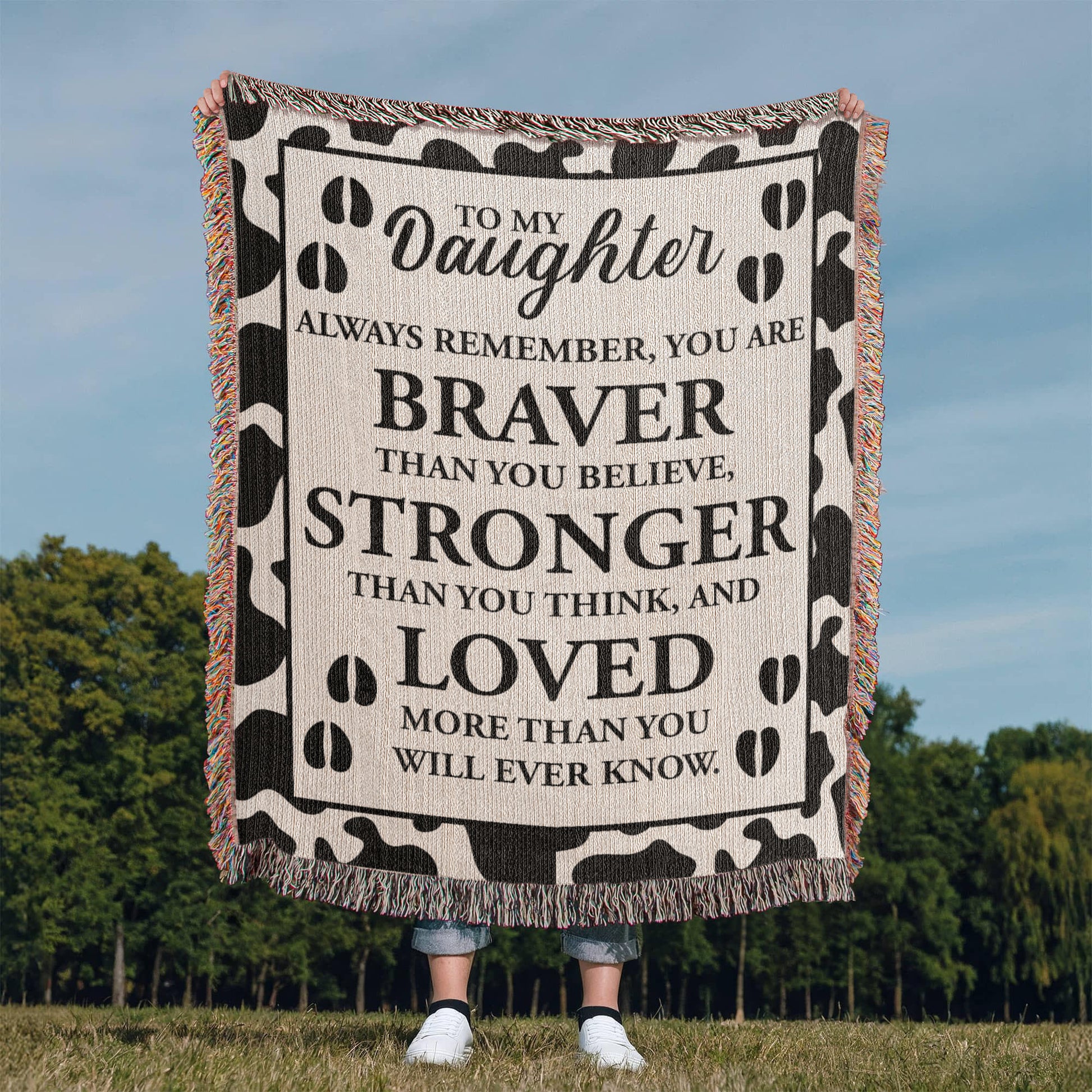 To My Daughter – Cow Print Blanket With “Braver, Stronger, Loved” Inspirational Message