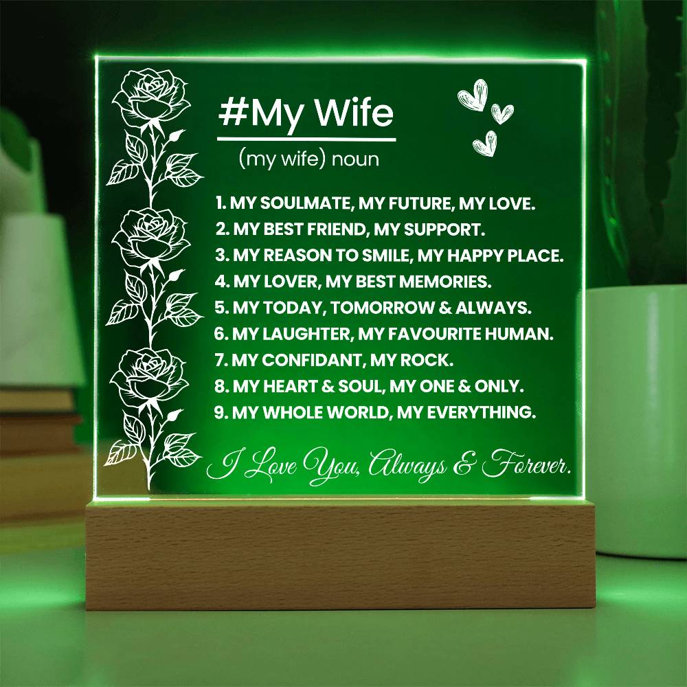 Your plaque will be crafted from premium acrylic with a professionally printed design for a polished look. It comes with a stylish wooden LED base, and you can choose between a USB plug-in option OR a cordless battery-operated option (requires 2 AAA batteries, not included). Both LED bases feature 7 vibrant colors, allowing the user to customize the lighting with various color changes and dynamic cycles.