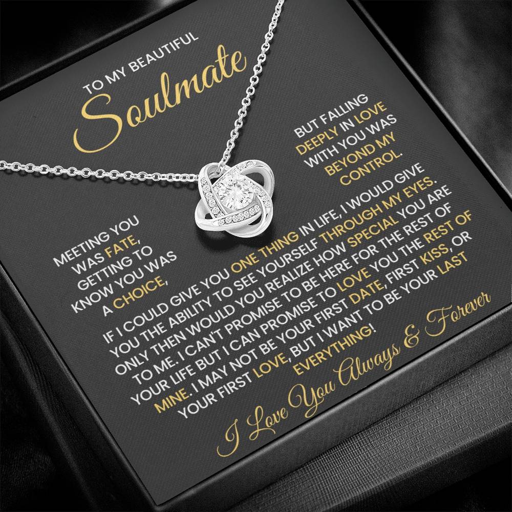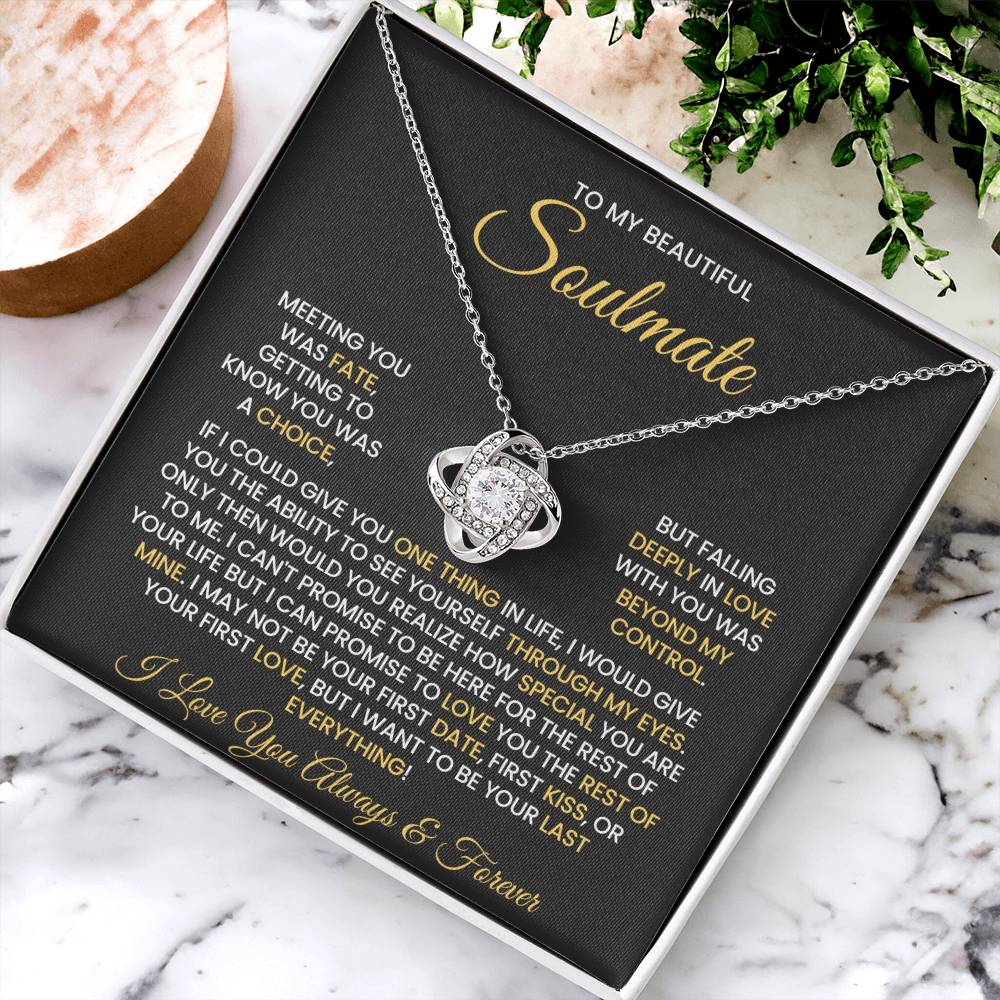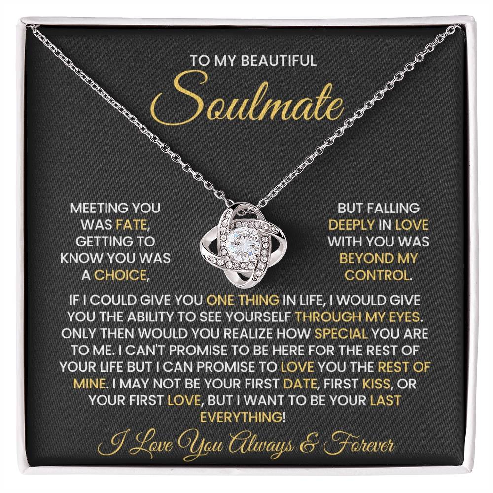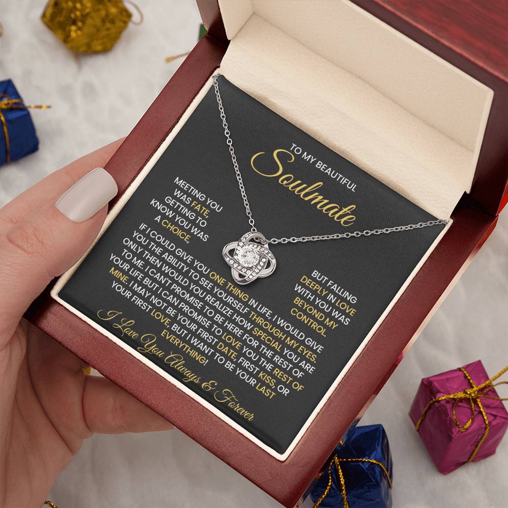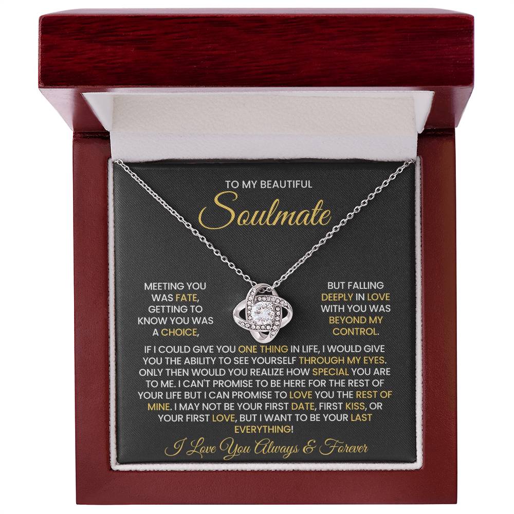 Message on the card "TO MY BEAUTIFUL SOULMATE, MEETING YOU WAS FATE, GETTING TO KNOW YOU WAS A CHOICE, BUT FALLING DEEPLY IN LOVE WITH YOU WAS BEYOND MY CONTROL. IF I COULD GIVE YOU ONE THING IN LIFE, I WOULD GIVE YOU THE ABILITY TO SEE YOURSELF THROUGH MY EYES. ONLY THEN WOULD YOU REALIZE HOW SPECIAL YOU ARE TO ME. I CAN'T PROMISE TO BE HERE FOR THE REST OF YOUR LIFE BUT I CAN PROMISE TO LOVE YOU THE REST OF MINE. I MAY NOT BE YOUR FIRST DATE, FIRST KISS, OR YOUR FIRST LOVE, BUT I WANT TO BE YOUR LAST EVERYTHING! I LOVE YOU ALWAYS & FOREVER"