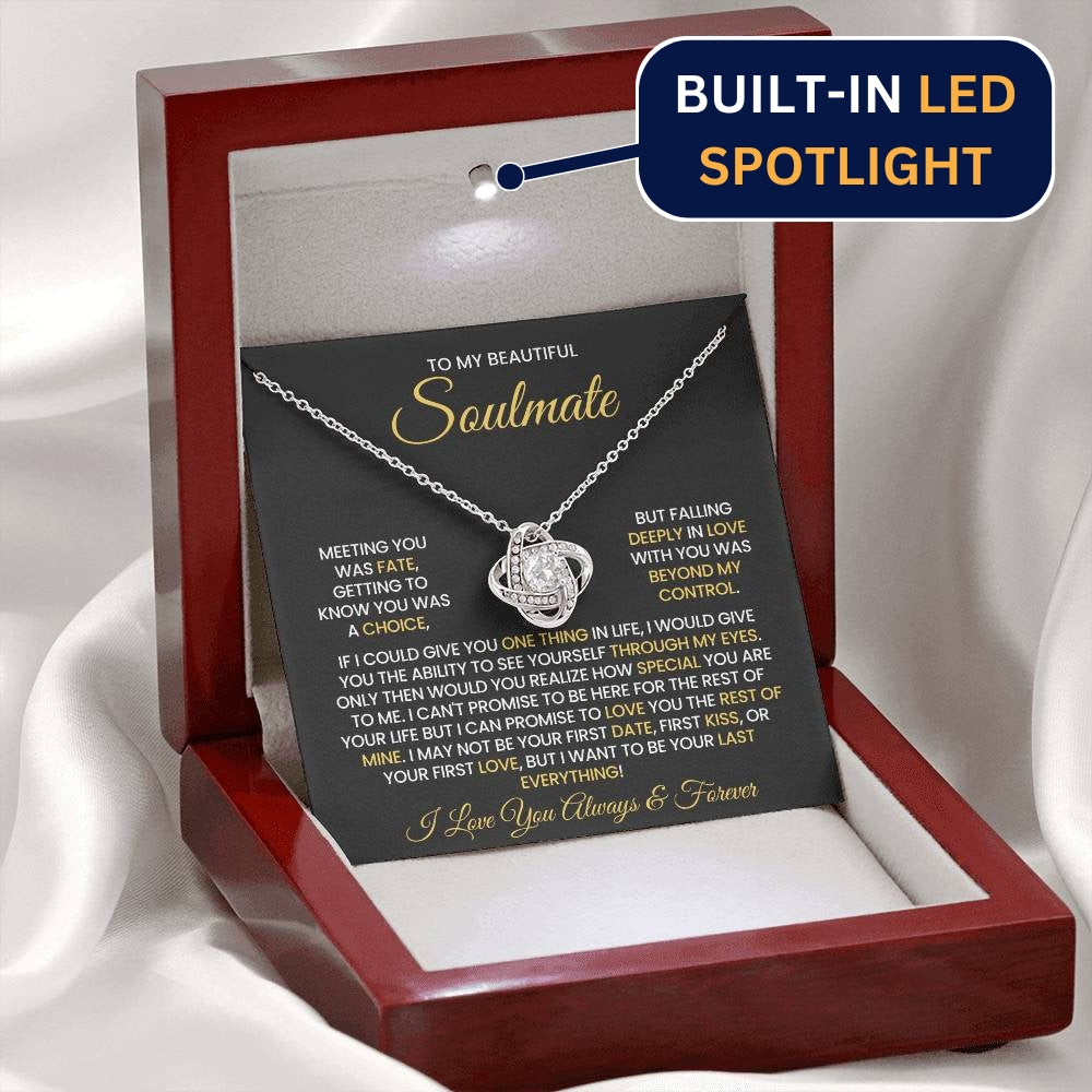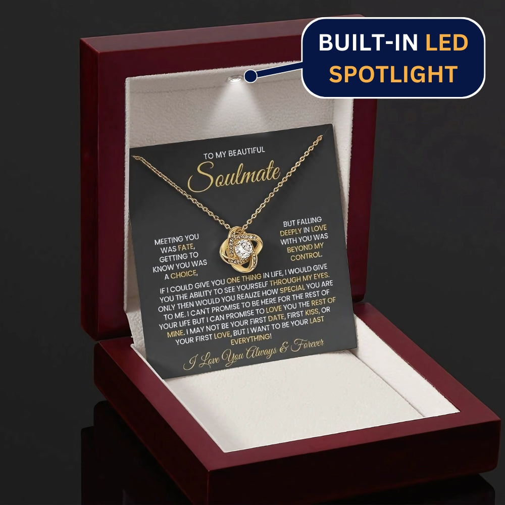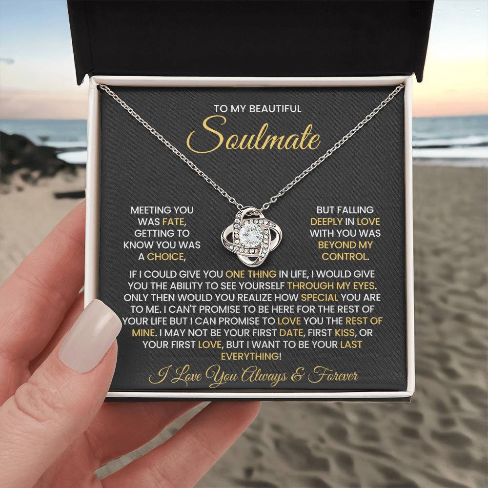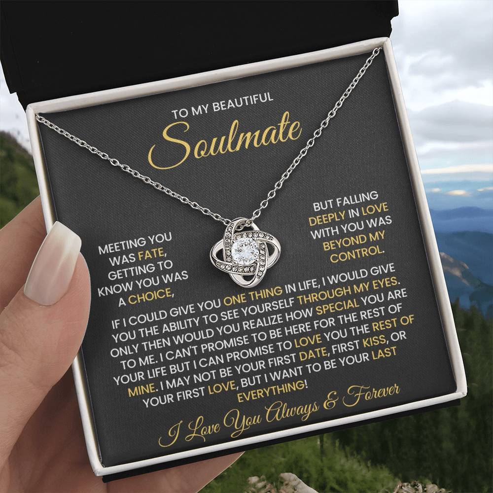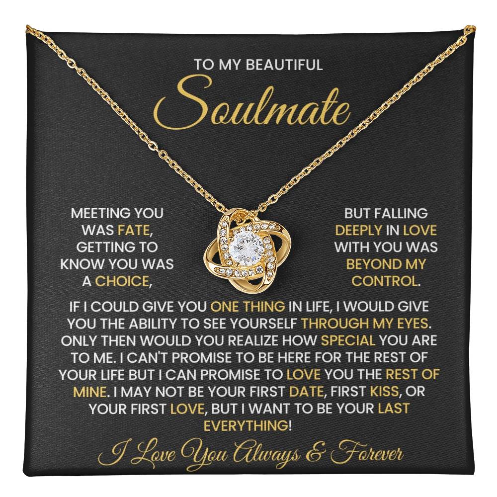 Message on the card "TO MY BEAUTIFUL SOULMATE, MEETING YOU WAS FATE, GETTING TO KNOW YOU WAS A CHOICE, BUT FALLING DEEPLY IN LOVE WITH YOU WAS BEYOND MY CONTROL. IF I COULD GIVE YOU ONE THING IN LIFE, I WOULD GIVE YOU THE ABILITY TO SEE YOURSELF THROUGH MY EYES. ONLY THEN WOULD YOU REALIZE HOW SPECIAL YOU ARE TO ME. I CAN'T PROMISE TO BE HERE FOR THE REST OF YOUR LIFE BUT I CAN PROMISE TO LOVE YOU THE REST OF MINE. I MAY NOT BE YOUR FIRST DATE, FIRST KISS, OR YOUR FIRST LOVE, BUT I WANT TO BE YOUR LAST EVERYTHING! I LOVE YOU ALWAYS & FOREVER"