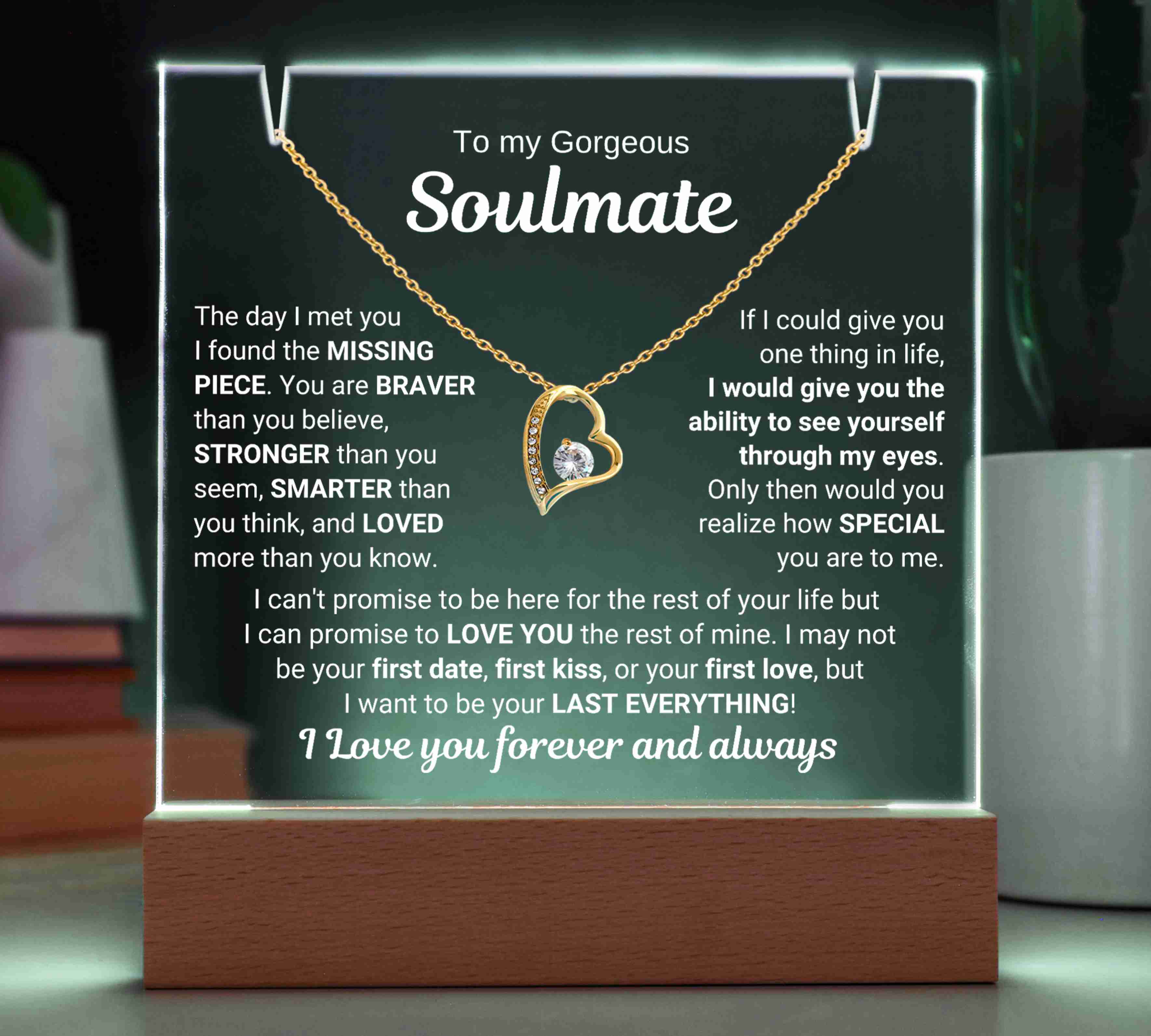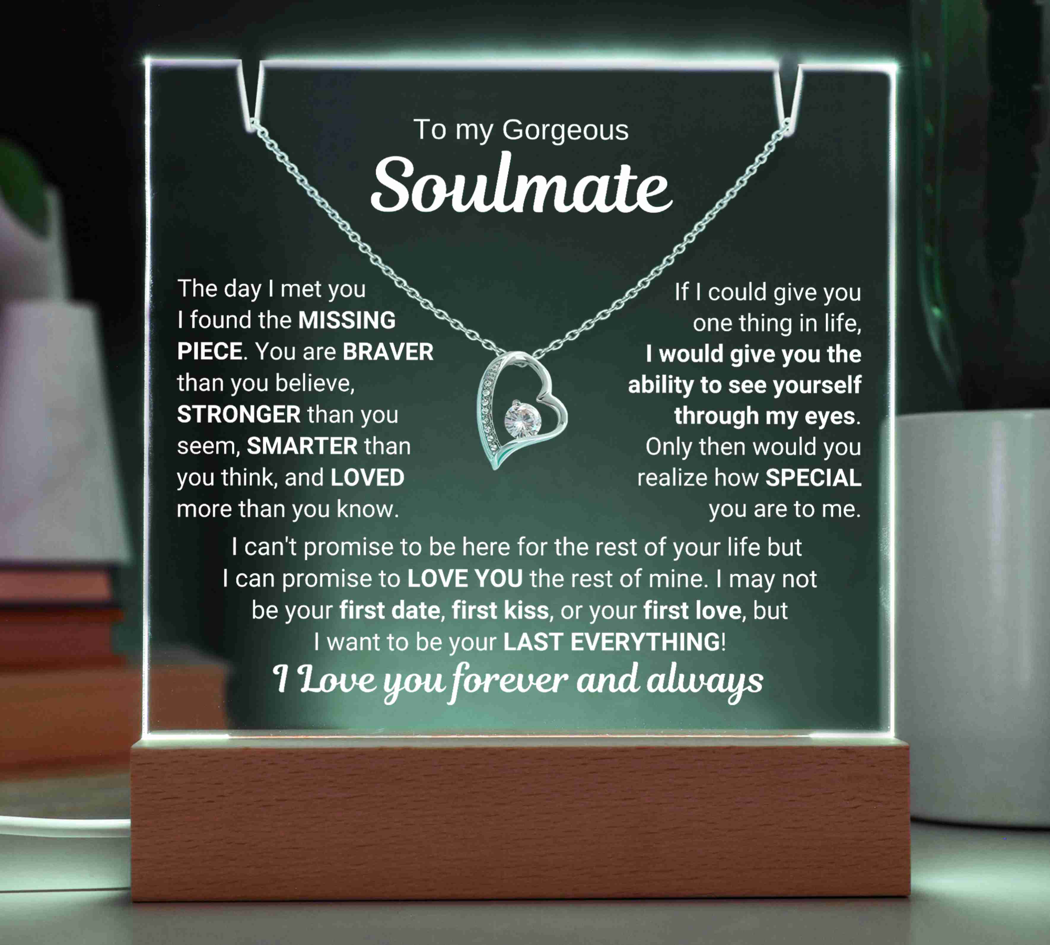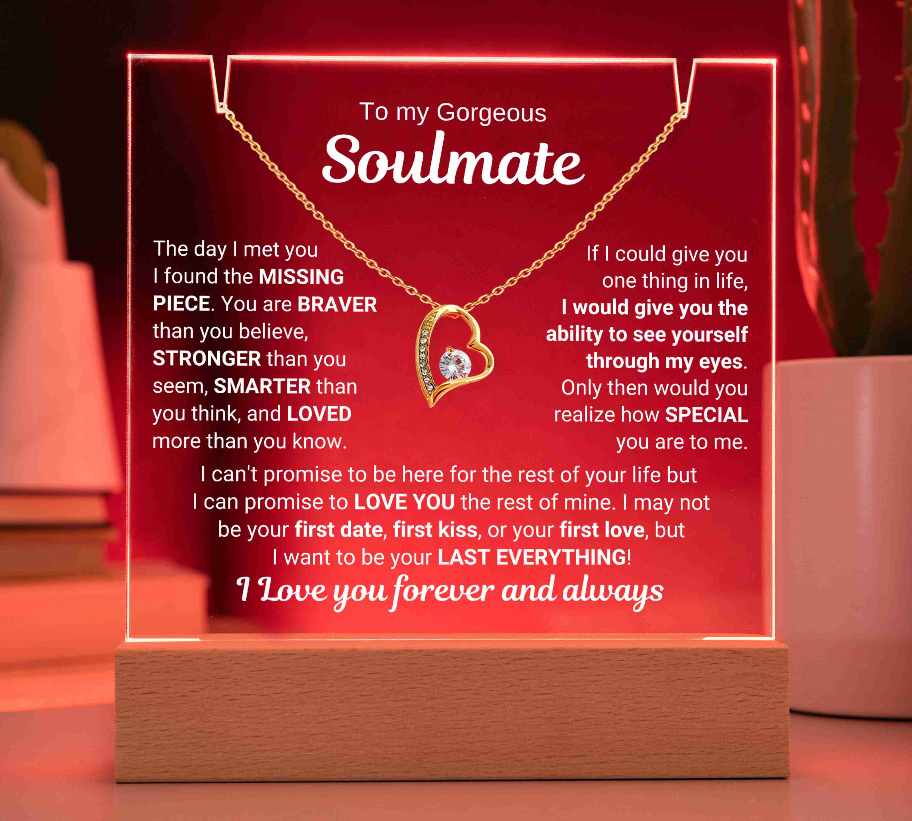 "TO MY SOULMATE, THE DAY I MET YOU I FOUND THE MISSING PIECE. YOU ARE BRAVER THAN YOU BELIEVE, STRONGER THAN YOU SEEM, SMARTER THAN YOU THINK, AND LOVED MORE THAN YOU KNOW. IF I COULD GIVE YOU ONE THING IN LIFE, I WOULD GIVE YOU THE ABILITY TO SEE YOURSELF THROUGH MY EYES. ONLY THEN WOULD YOU REALIZE HOW SPECIAL YOU ARE TO ME. I CAN'T PROMISE TO BE HERE FOR THE REST OF YOUR LIFE BUT I CAN PROMISE TO LOVE YOU THE REST OF MINE. I MAY NOT BE YOUR FIRST DATE, FIRST KISS, OR YOUR FIRST LOVE, BUT I WANT TO BE YOUR LAST EVERYTHING! I LOVE YOU FOREVER AND ALWAYS"