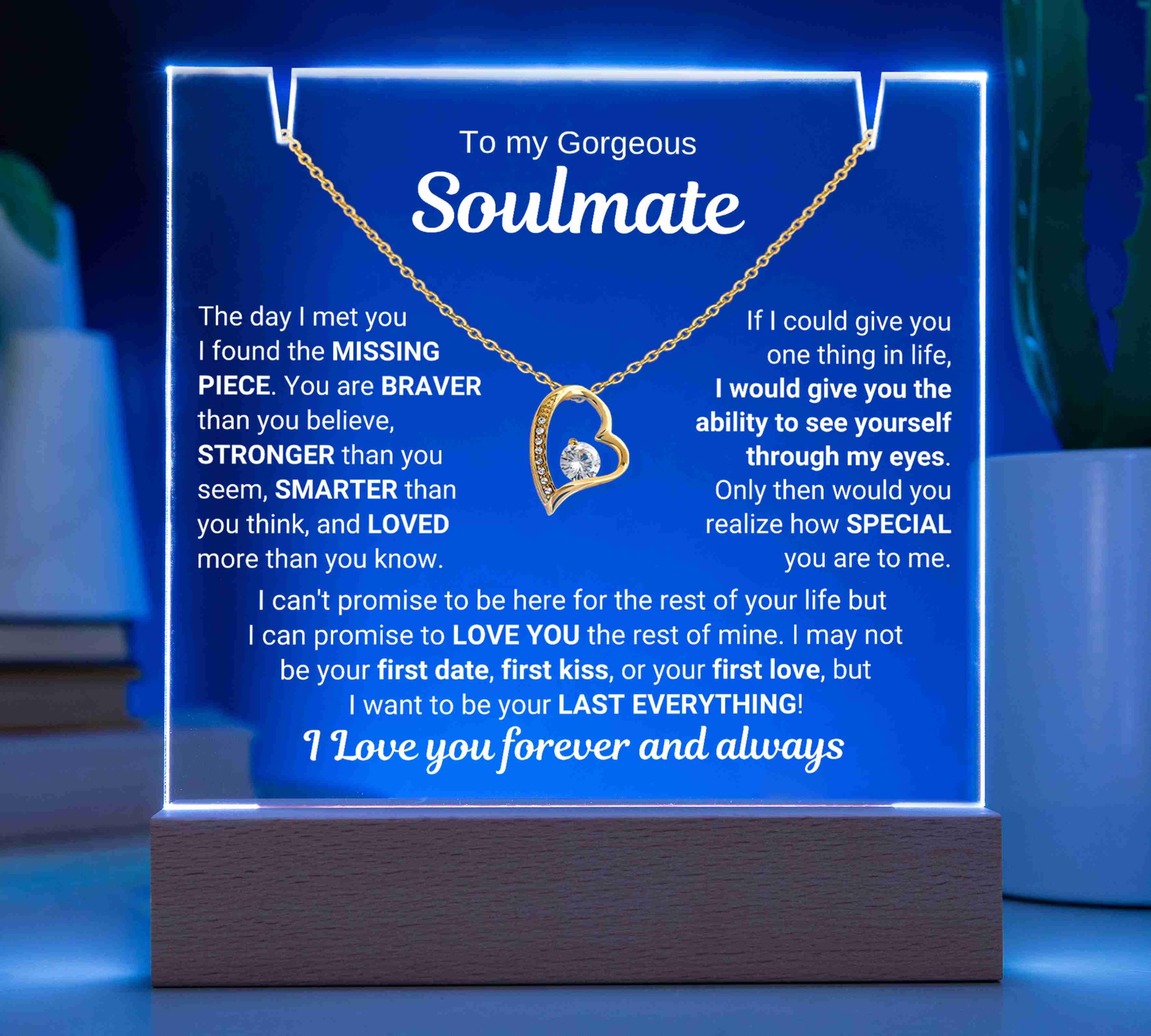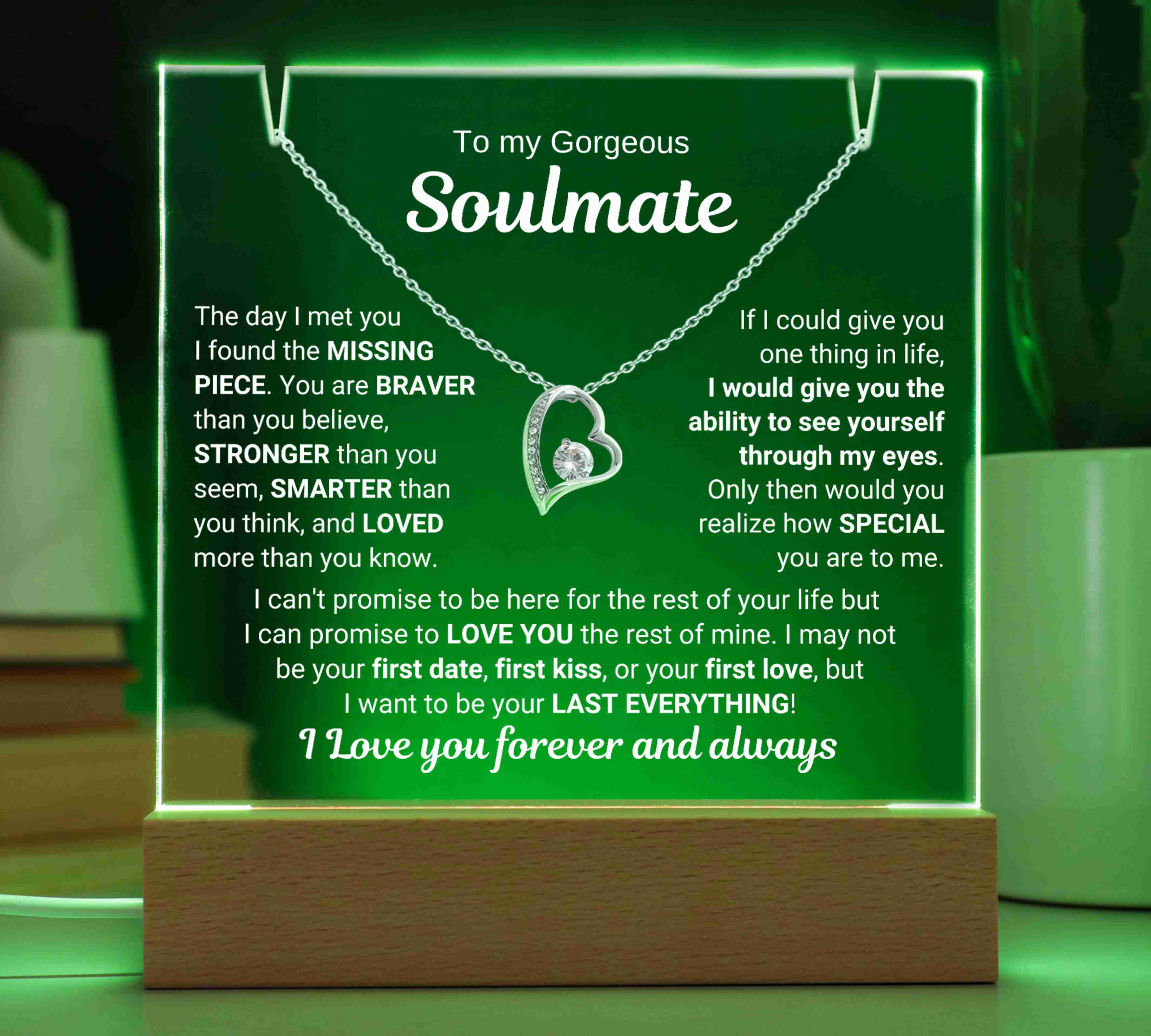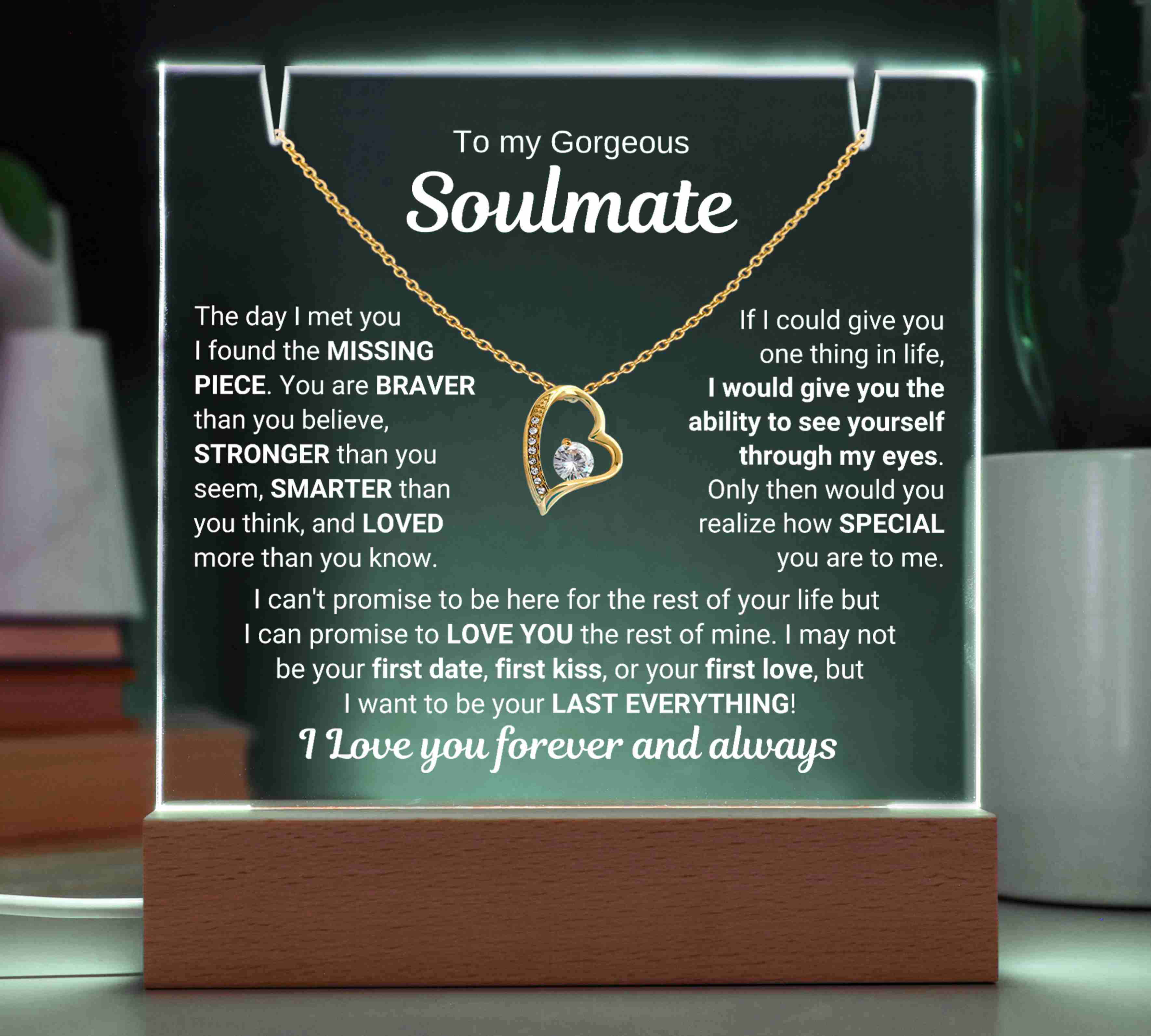 "TO MY SOULMATE, THE DAY I MET YOU I FOUND THE MISSING PIECE. YOU ARE BRAVER THAN YOU BELIEVE, STRONGER THAN YOU SEEM, SMARTER THAN YOU THINK, AND LOVED MORE THAN YOU KNOW. IF I COULD GIVE YOU ONE THING IN LIFE, I WOULD GIVE YOU THE ABILITY TO SEE YOURSELF THROUGH MY EYES. ONLY THEN WOULD YOU REALIZE HOW SPECIAL YOU ARE TO ME. I CAN'T PROMISE TO BE HERE FOR THE REST OF YOUR LIFE BUT I CAN PROMISE TO LOVE YOU THE REST OF MINE. I MAY NOT BE YOUR FIRST DATE, FIRST KISS, OR YOUR FIRST LOVE, BUT I WANT TO BE YOUR LAST EVERYTHING! I LOVE YOU FOREVER AND ALWAYS"