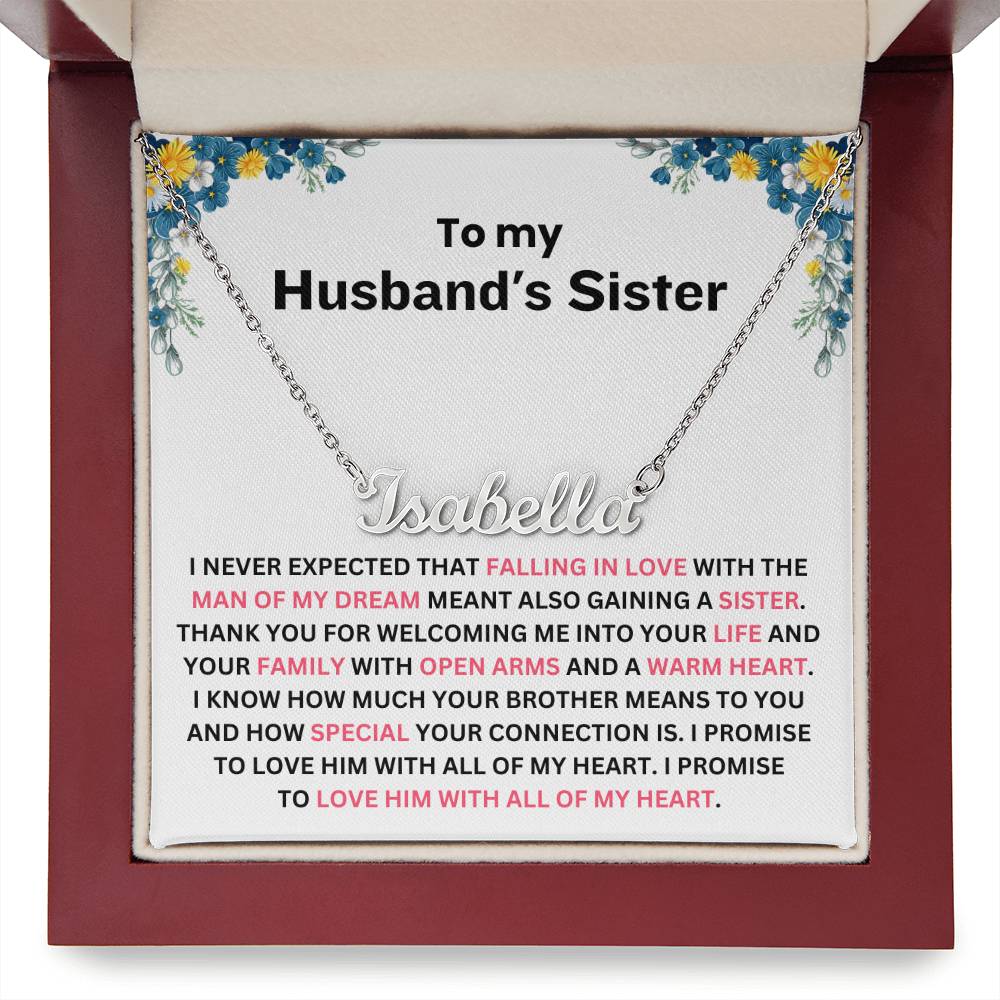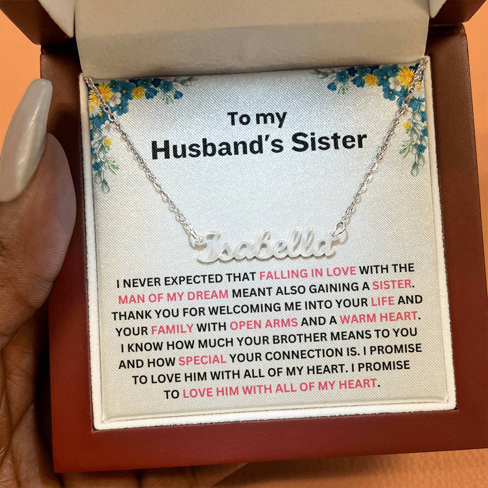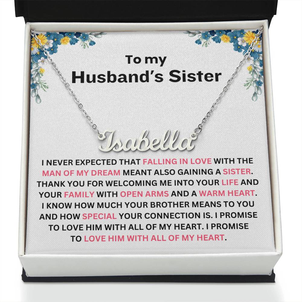 TO MY HUSBAND'S SISTER. I NEVER EXPECTED THAT FALLING IN LOVE WITH THE MAN OF MY DREAM MEANT ALSO GAINING A SISTER. THANK YOU FOR WELCOMING ME INTO YOUR LIFE AND YOUR FAMILY WITH OPEN ARMS AND A WARM HEART. I KNOW HOW MUCH YOUR BROTHER MEANS TO YOU AND HOW SPECIAL YOUR CONNECTION IS. I PROMISE TO LOVE HIM WITH ALL OF MY HEART. I PROMISE TO LOVE HIM WITH ALL OF MY HEART.