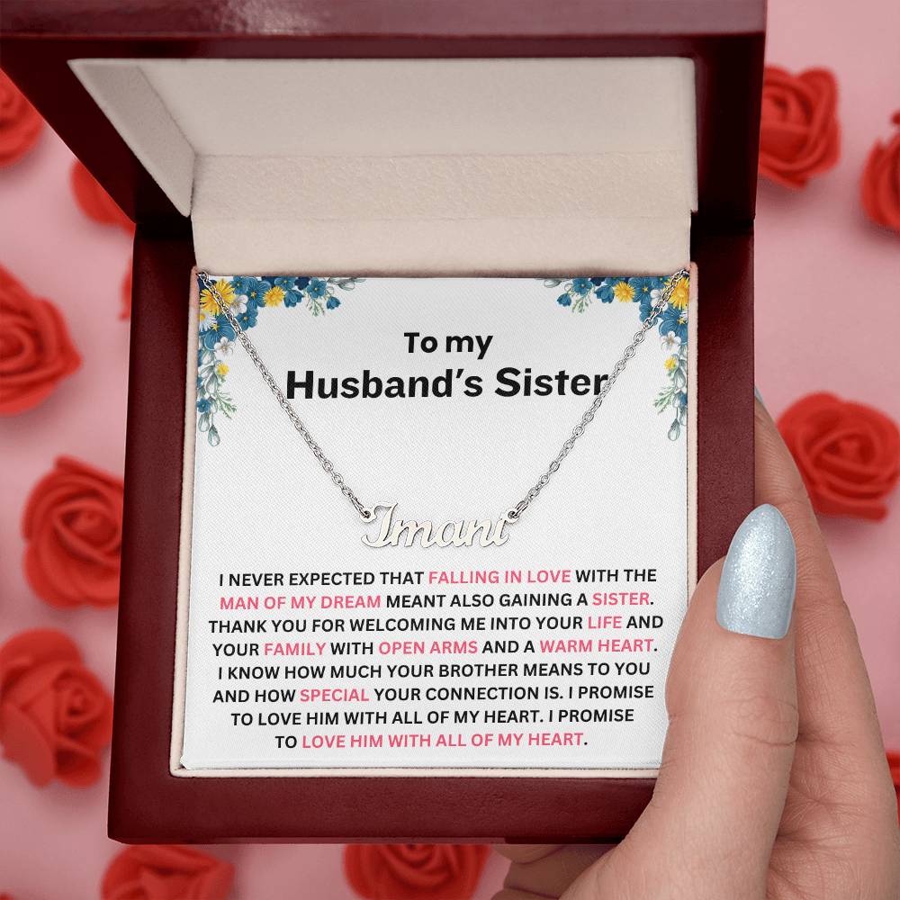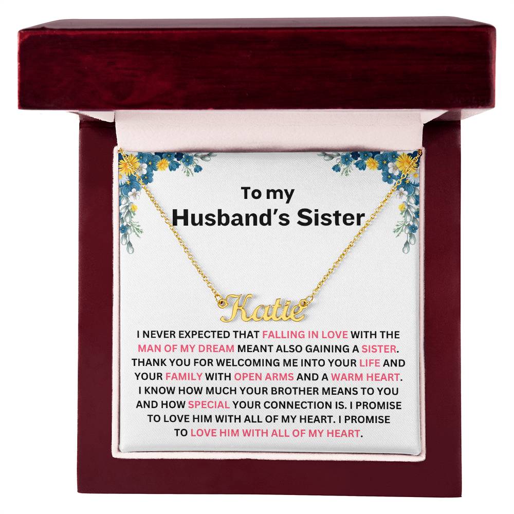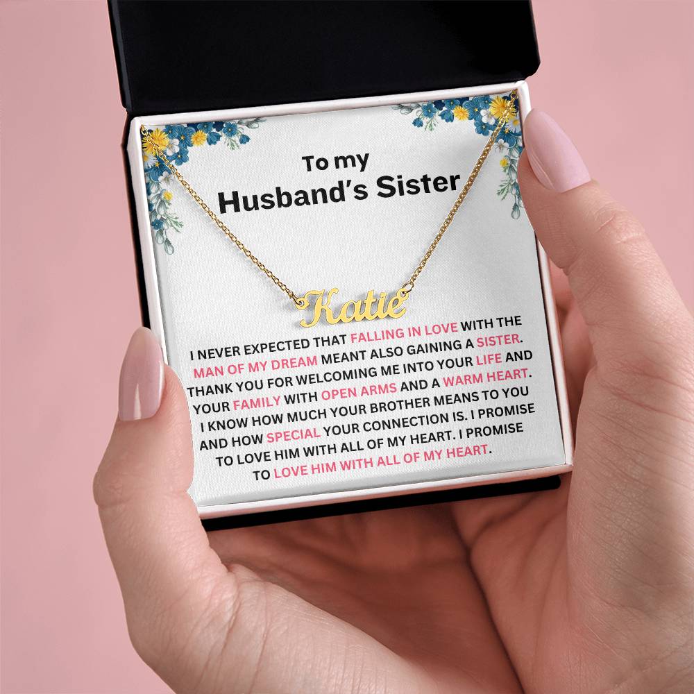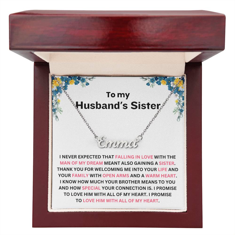 TO MY HUSBAND'S SISTER. I NEVER EXPECTED THAT FALLING IN LOVE WITH THE MAN OF MY DREAM MEANT ALSO GAINING A SISTER. THANK YOU FOR WELCOMING ME INTO YOUR LIFE AND YOUR FAMILY WITH OPEN ARMS AND A WARM HEART. I KNOW HOW MUCH YOUR BROTHER MEANS TO YOU AND HOW SPECIAL YOUR CONNECTION IS. I PROMISE TO LOVE HIM WITH ALL OF MY HEART. I PROMISE TO LOVE HIM WITH ALL OF MY HEART.