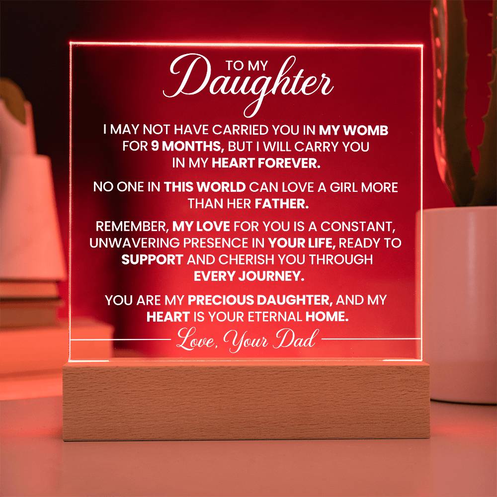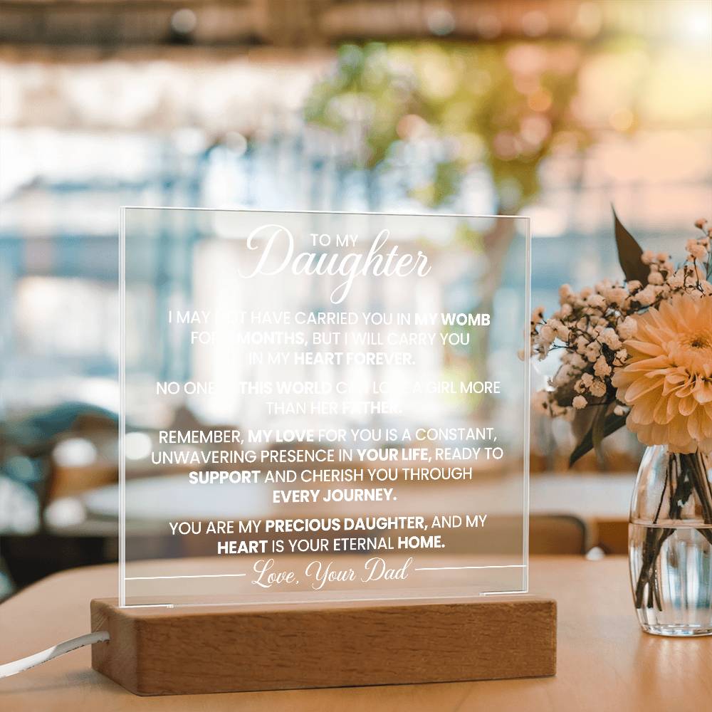 Your plaque will be crafted from premium acrylic with a professionally printed design for a polished look. It comes with a stylish wooden LED base, and you can choose between a USB plug-in option OR a cordless battery-operated option (requires 2 AAA batteries, not included). Both LED bases feature 7 vibrant colors, allowing the user to customize the lighting with various color changes and dynamic cycles.
