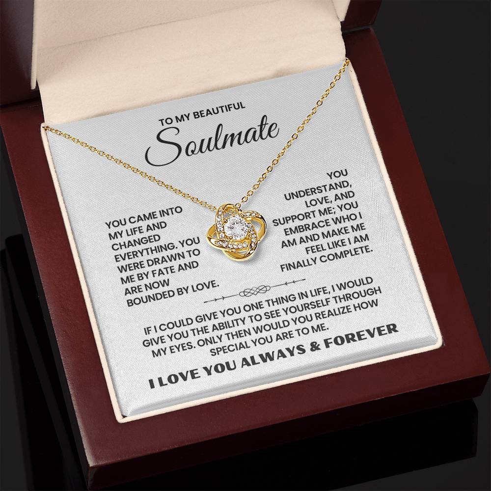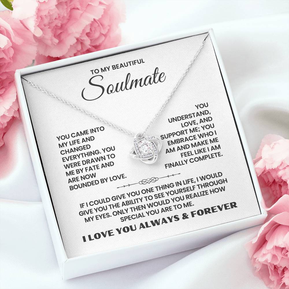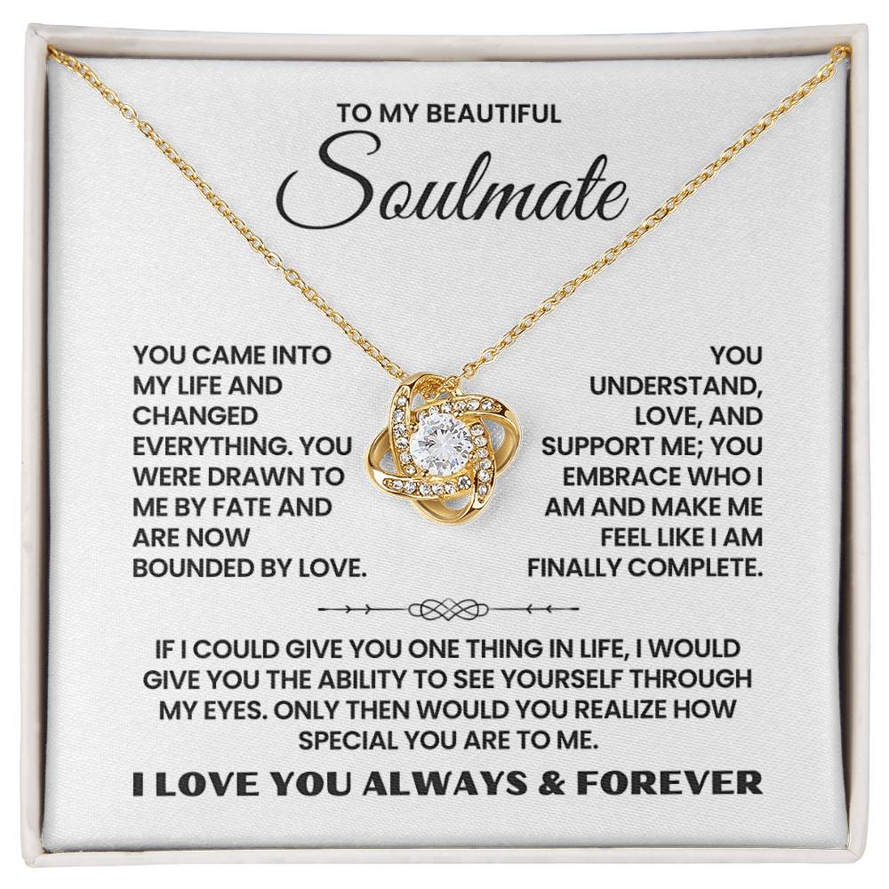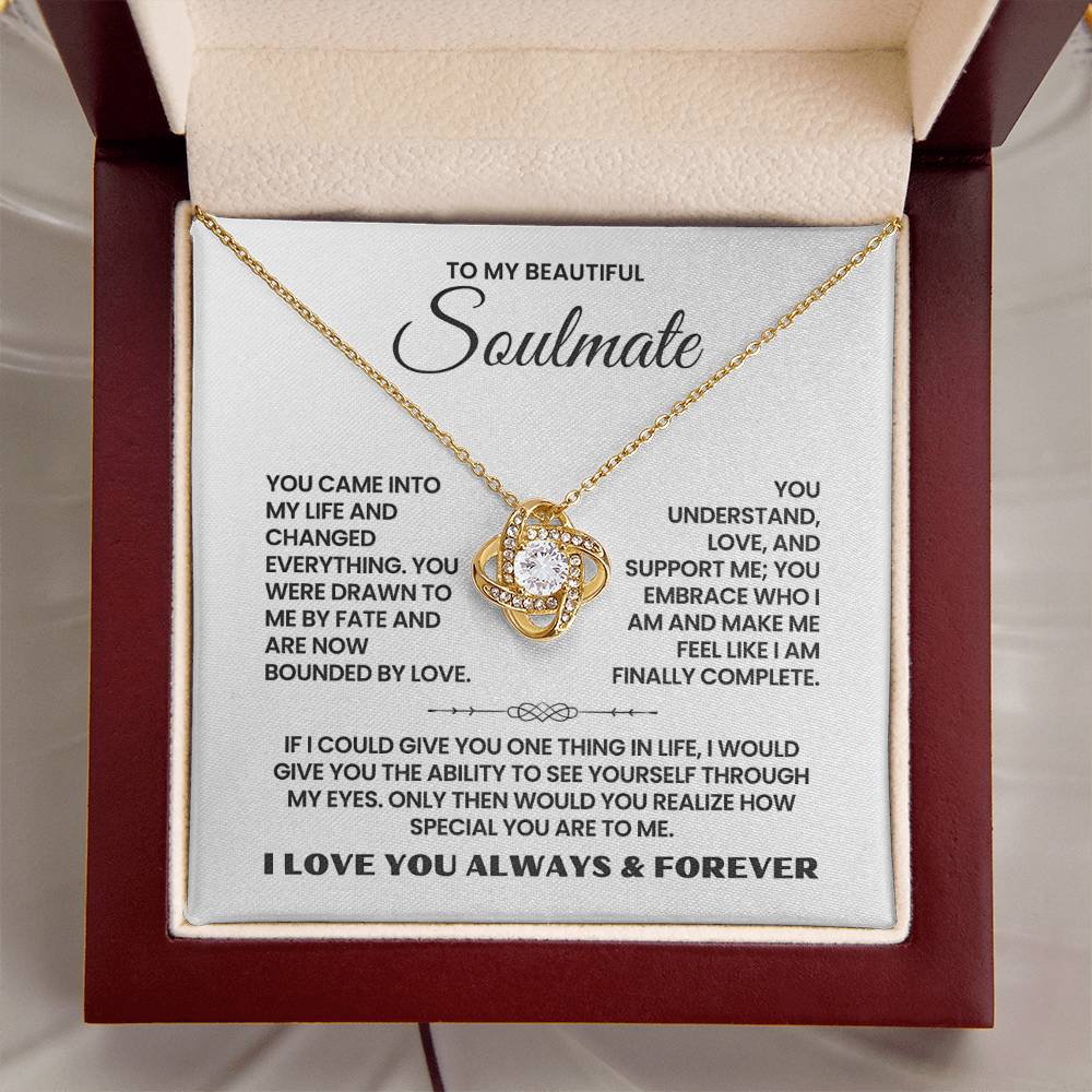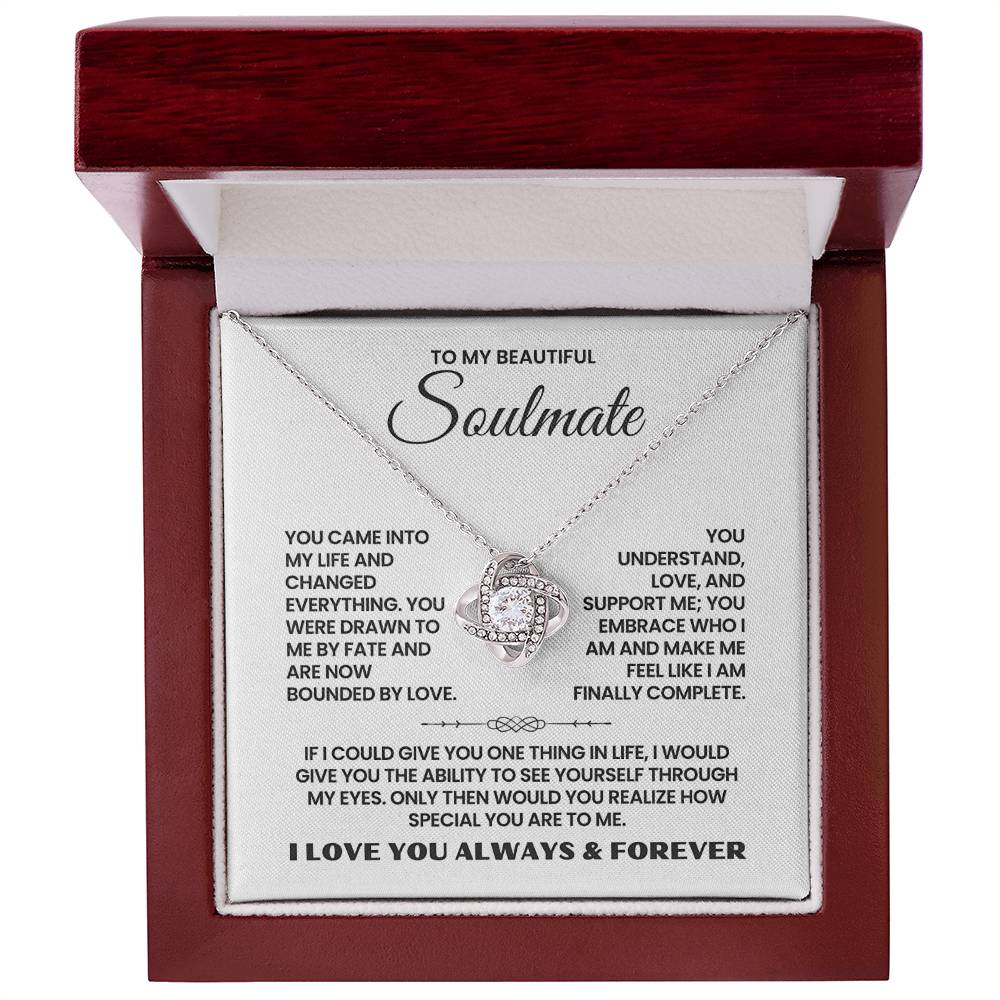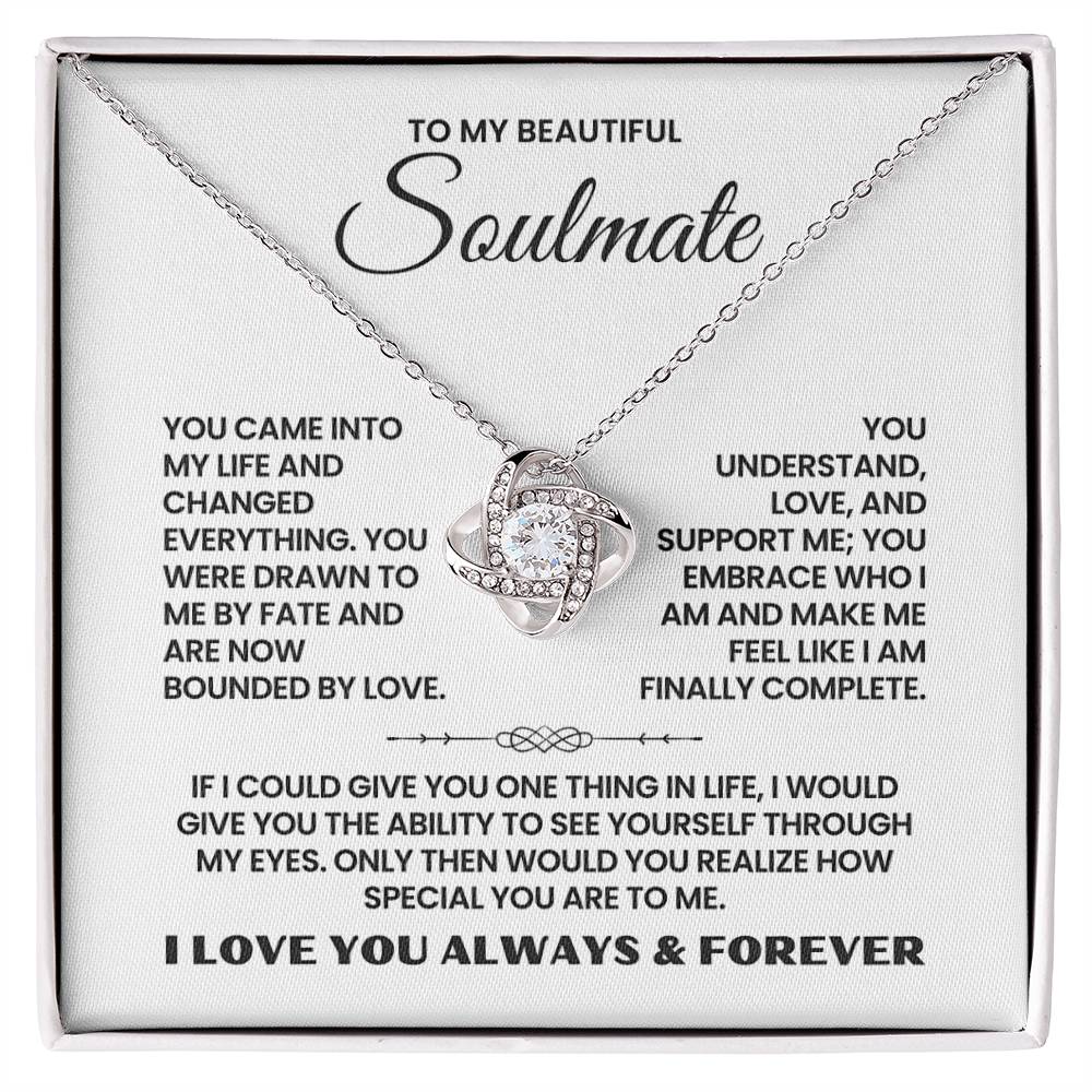 TO MY BEAUTIFUL SOULMATE, YOU CAME INTO MY LIFE AND CHANGED EVERYTHING. YOU WERE DRAWN TO ME BY FATE AND ARE NOW BOUNDED BY LOVE. YOU UNDERSTAND, LOVE, AND SUPPORT ME; YOU EMBRACE WHO I AM AND MAKE ME FEEL LIKE I AM FINALLY COMPLETE. IF I COULD GIVE YOU ONE THING IN LIFE, I WOULD GIVE YOU THE ABILITY TO SEE YOURSELF THROUGH MY EYES. ONLY THEN WOULD YOU REALIZE HOW SPECIAL YOU ARE TO ME. I LOVE YOU ALWAYS & FOREVER