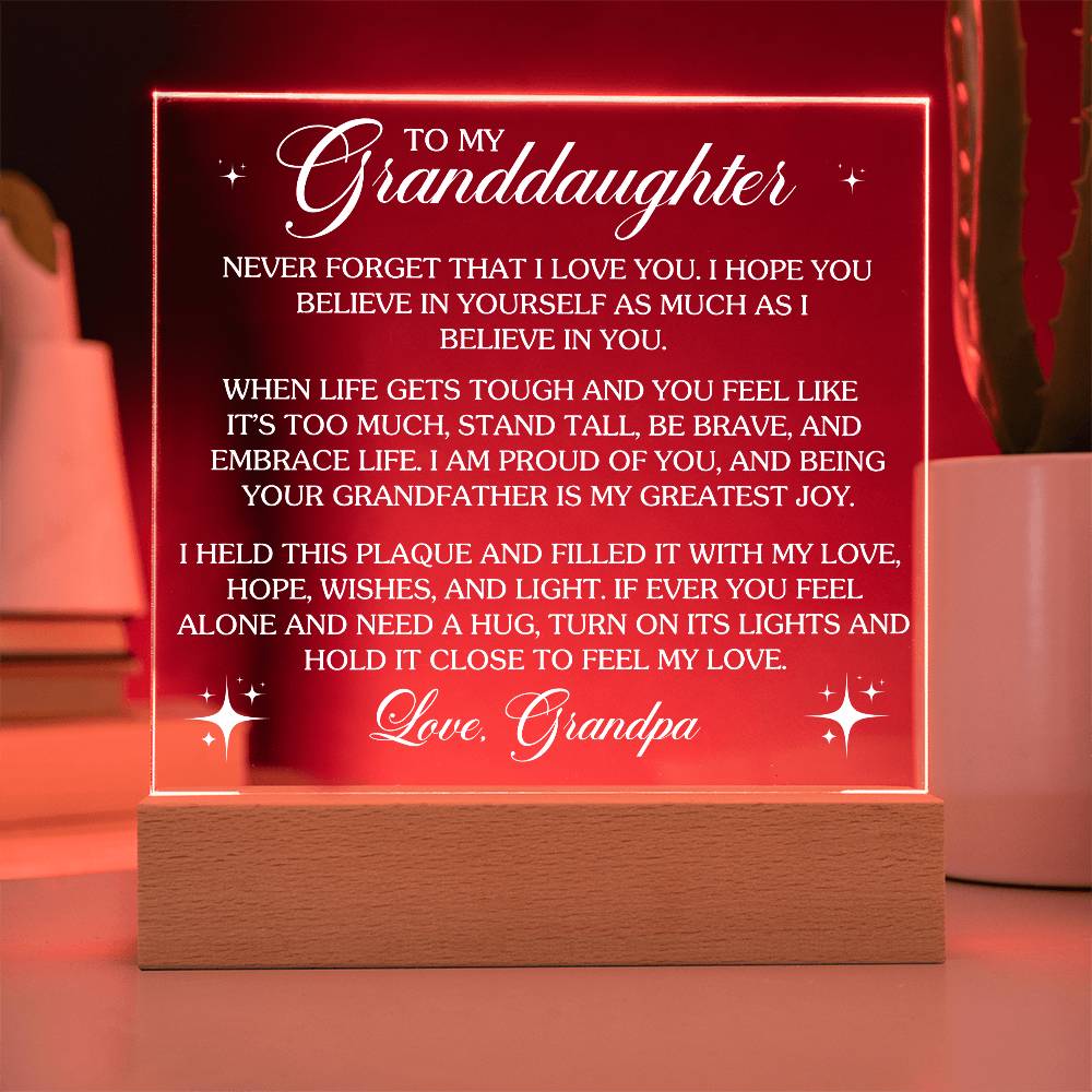 Your plaque will be crafted from premium acrylic with a professionally printed design for a polished look. It comes with a stylish wooden LED base, and you can choose between a USB plug-in option OR a cordless battery-operated option (requires 2 AAA batteries, not included). Both LED bases feature 7 vibrant colors, allowing the user to customize the lighting with various color changes and dynamic cycles.