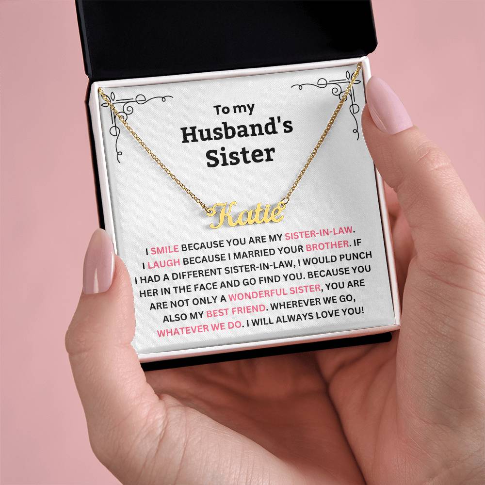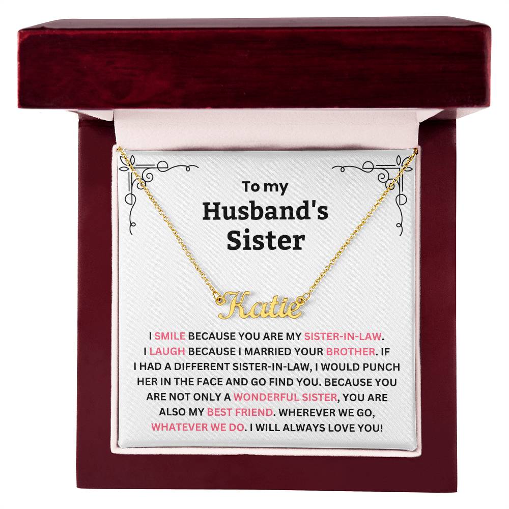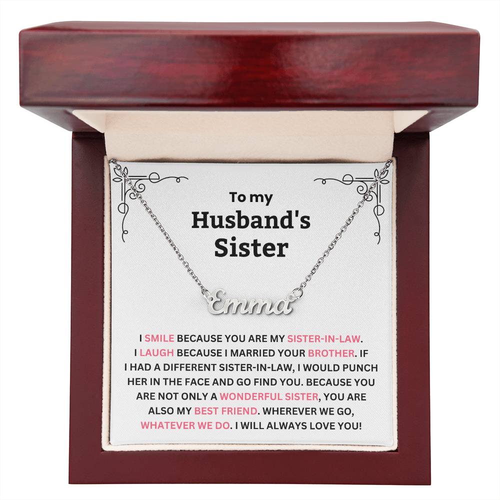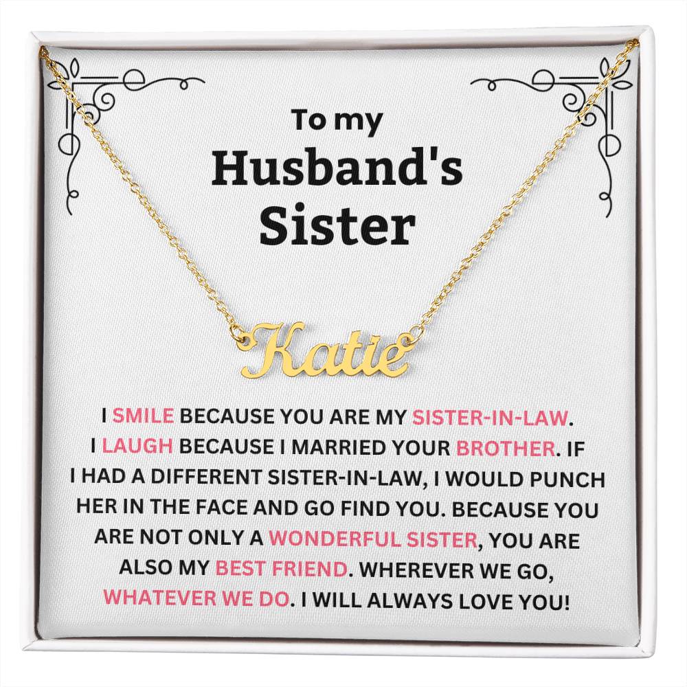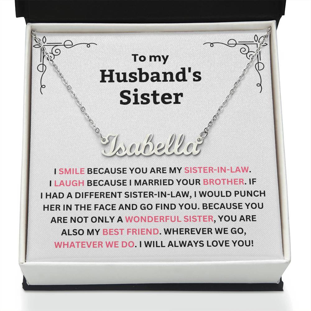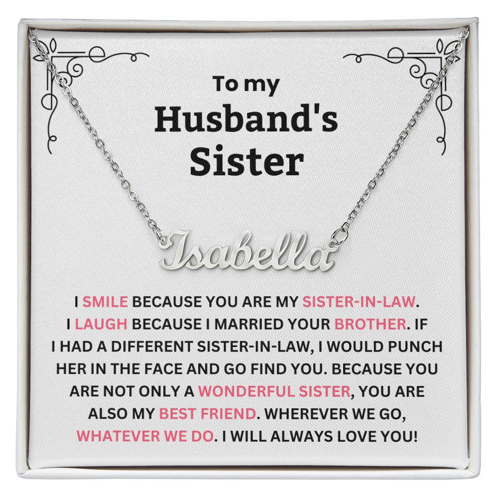 TO MY HUSBAND'S SISTER. I SMILE BECAUSE YOU ARE MY SISTER-IN-LAW. I LAUGH BECAUSE I MARRIED YOUR BROTHER. IF I HAD A DIFFERENT SISTER-IN-LAW, I WOULD PUNCH HER IN THE FACE AND GO FIND YOU. BECAUSE YOU ARE NOT ONLY A WONDERFUL SISTER, YOU ARE ALSO MY BEST FRIEND. WHEREVER WE GO, WHATEVER WE DO. I WILL ALWAYS LOVE YOU!